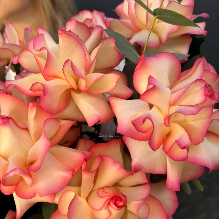 В сезон (весна и лето) ассортимент шире: пионы, ранункулюсы, тюльпаны местные и голландские, ромашки, гортензия. Круглый год — розы от 50 см стебель, кустовые хризантемы, альстромерия, гипсофила, эустома, гвоздики, эвкалипт для миксов.