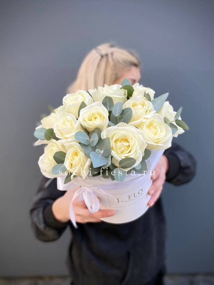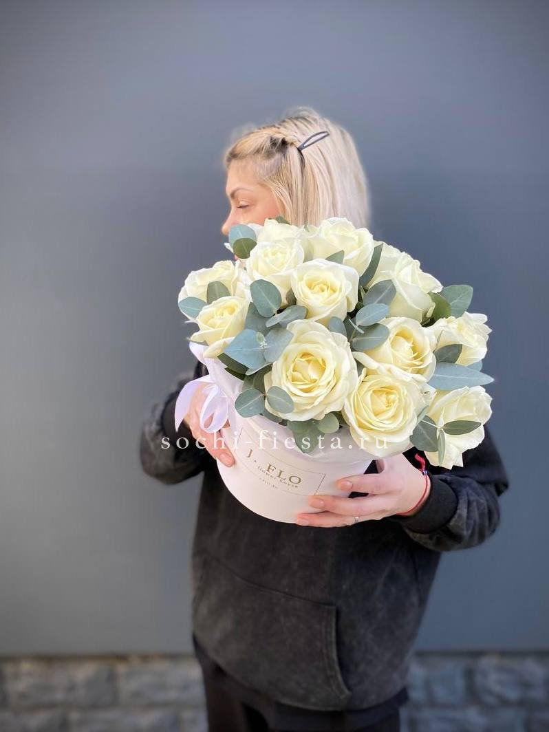 Пятнадцать белых роз собраны в компактный бокс с ветками эвкалипта. Чистая форма и спокойная гамма создают ощущение воздуха и света в любом пространстве.