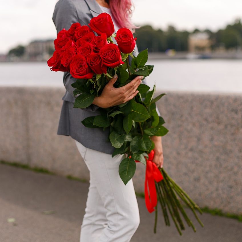 Девятнадцать бутонов собраны в плотную охапку, где каждый стебель держит свою линию. Красный оттенок звучит чисто и открыто, без лишних деталей. Букет готов говорить сам за себя.