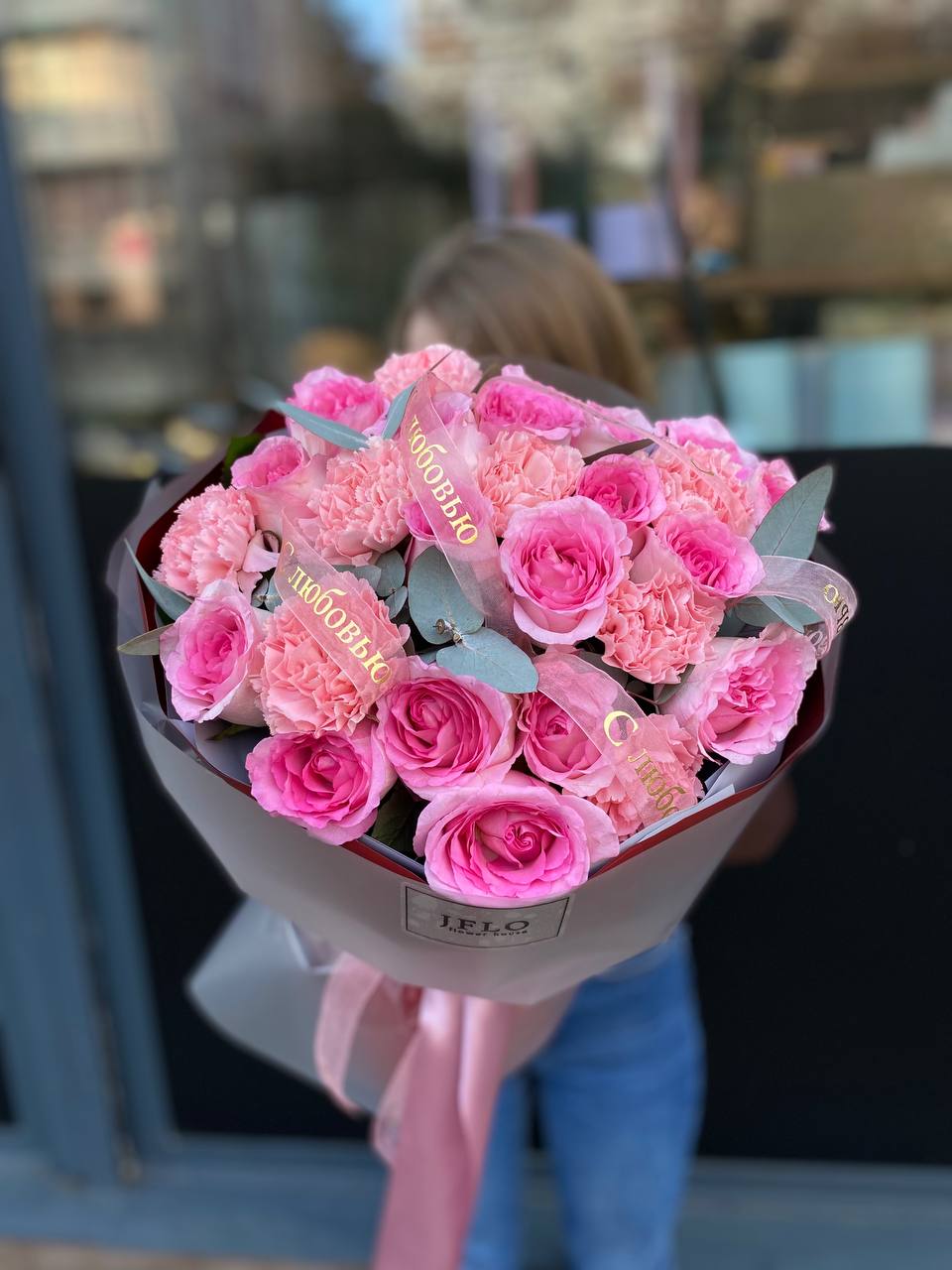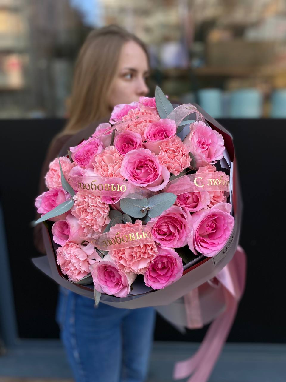 диантус, розовые розы, бомбастик, хризантемы, эустома, эвкалипт, бокс №20