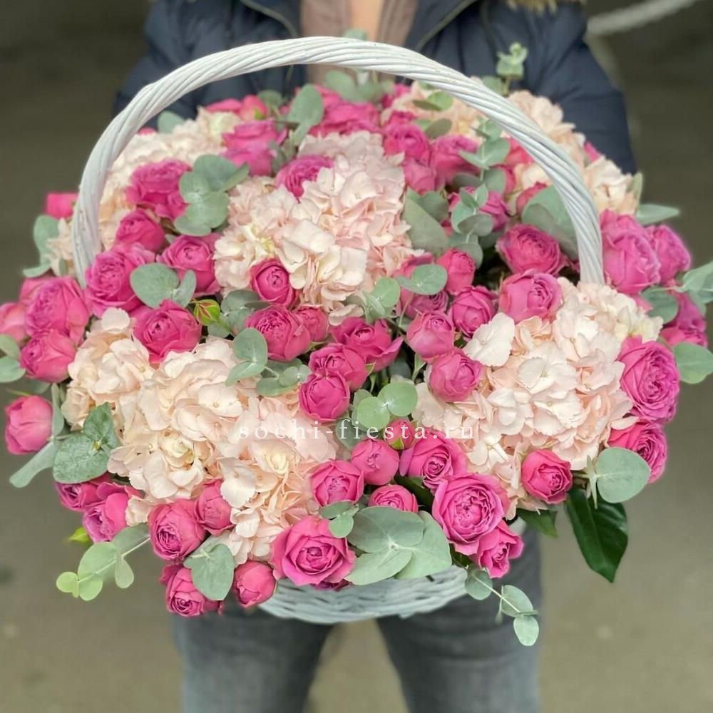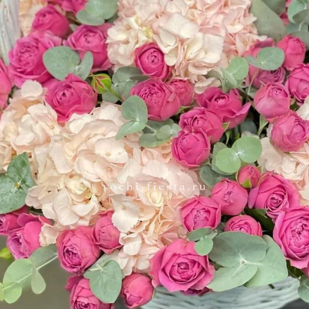 гортензия, хлопок, бомбастик, белая роза, маттиола- может меняться от сезона на диантус, ковыль, упаковка.
