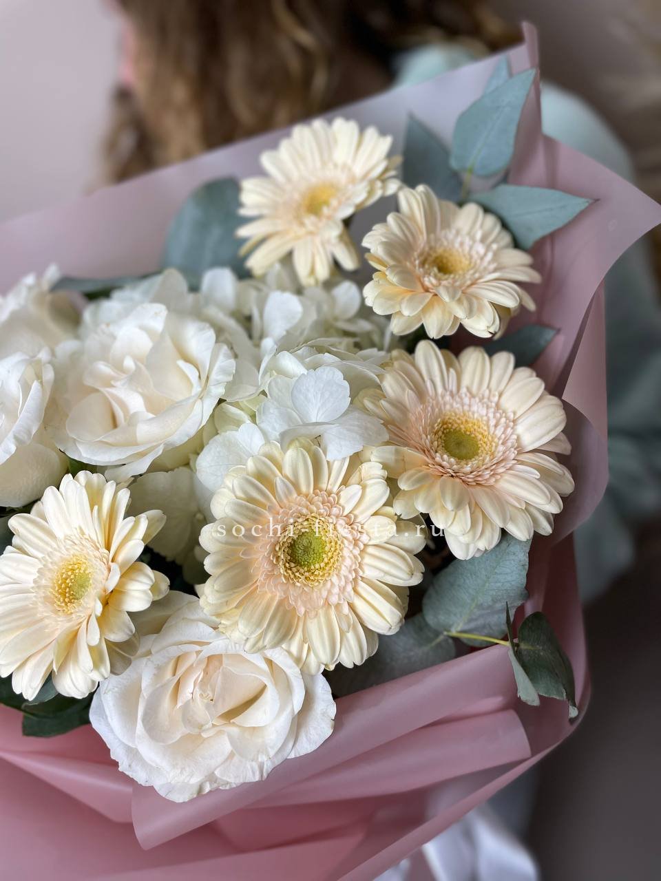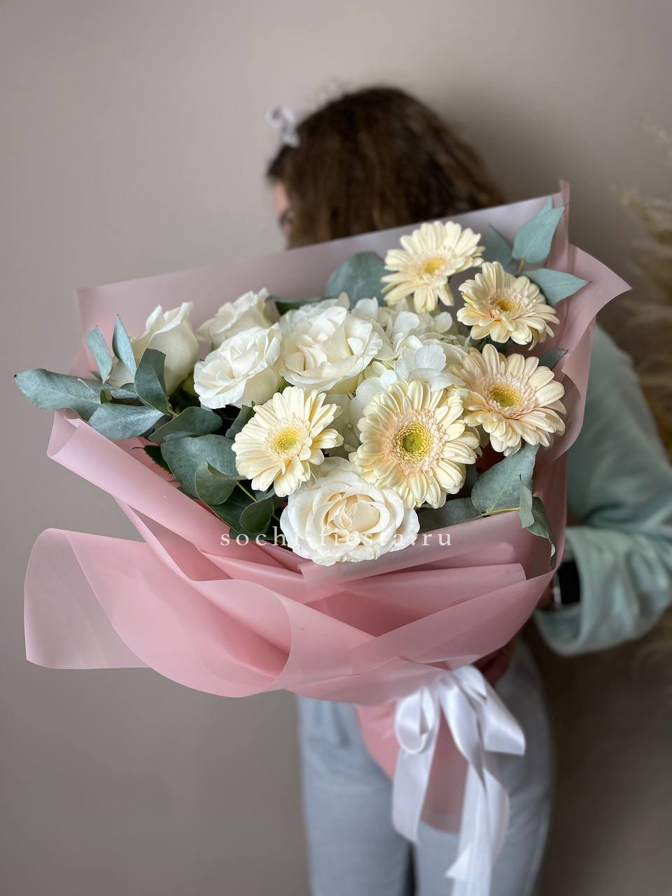Этот букет — словно облако нежности и мечтательности. Бутончики кустовых роз, напоминающие тугие шарики, имеют светлый кремовый цвет с легким розовым оттенком. В сочетании с веточками свежего эвкалипта они создают атмосферу легкости и романтики. Это идеальный подарок для выражения самых светлых и теплых чувств, который растопит любое сердце.