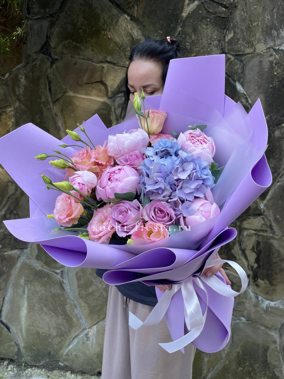 эустома, розовые пионы Сара Бернар, гортензия, розы одноголовые, эвкалипт, лента, дизайнерская упаковка.