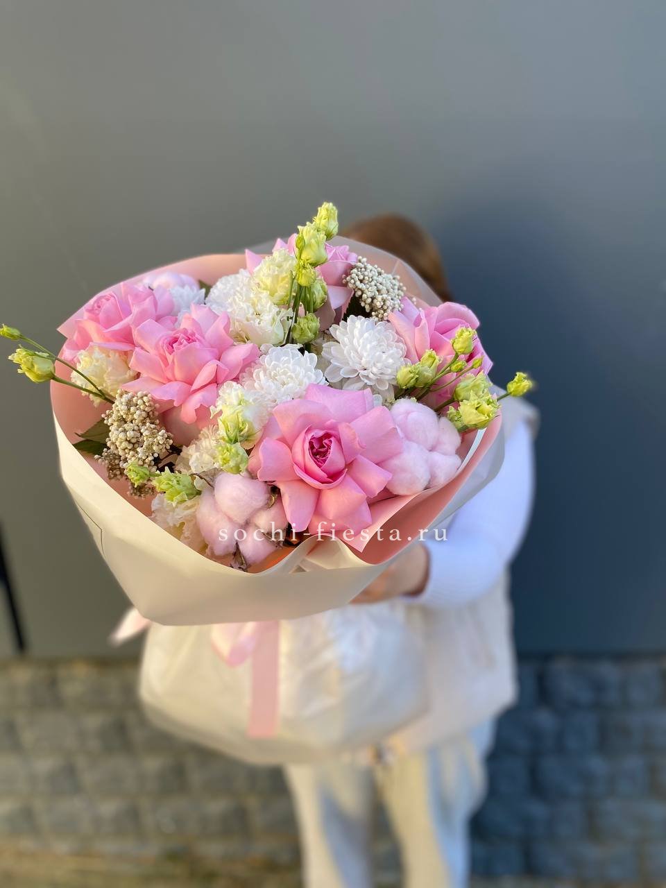 Розовые оттенки роз и эустомы переплетаются с яркой хризантемой в теплой композиции. Хлопок добавляет текстурной мягкости, а озотамус создает ажурную основу. Букет дарит радостное настроение и естественную красоту.