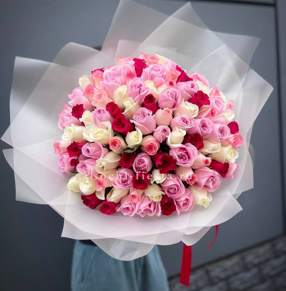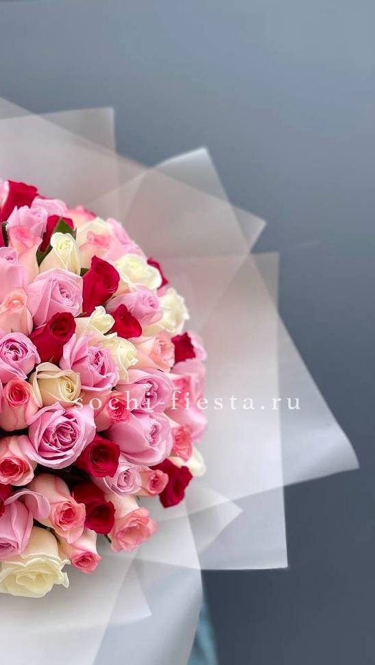 роза белого и розового оттенка 555 шт., оформление в каркас или корзину.