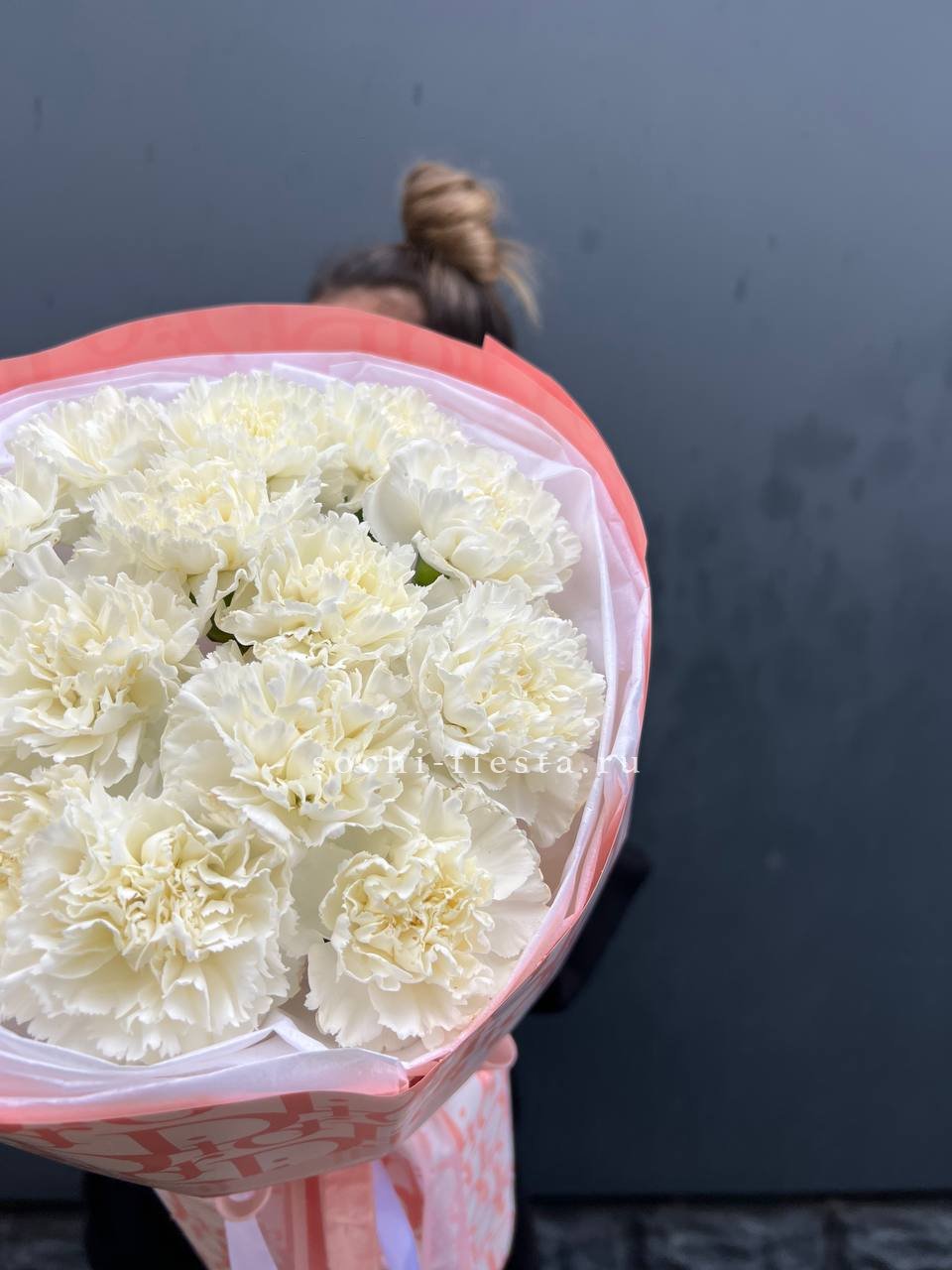 15 белых диантусов,ковыль,лагурус, эвкалипт, лента, дизайнерская пленка.