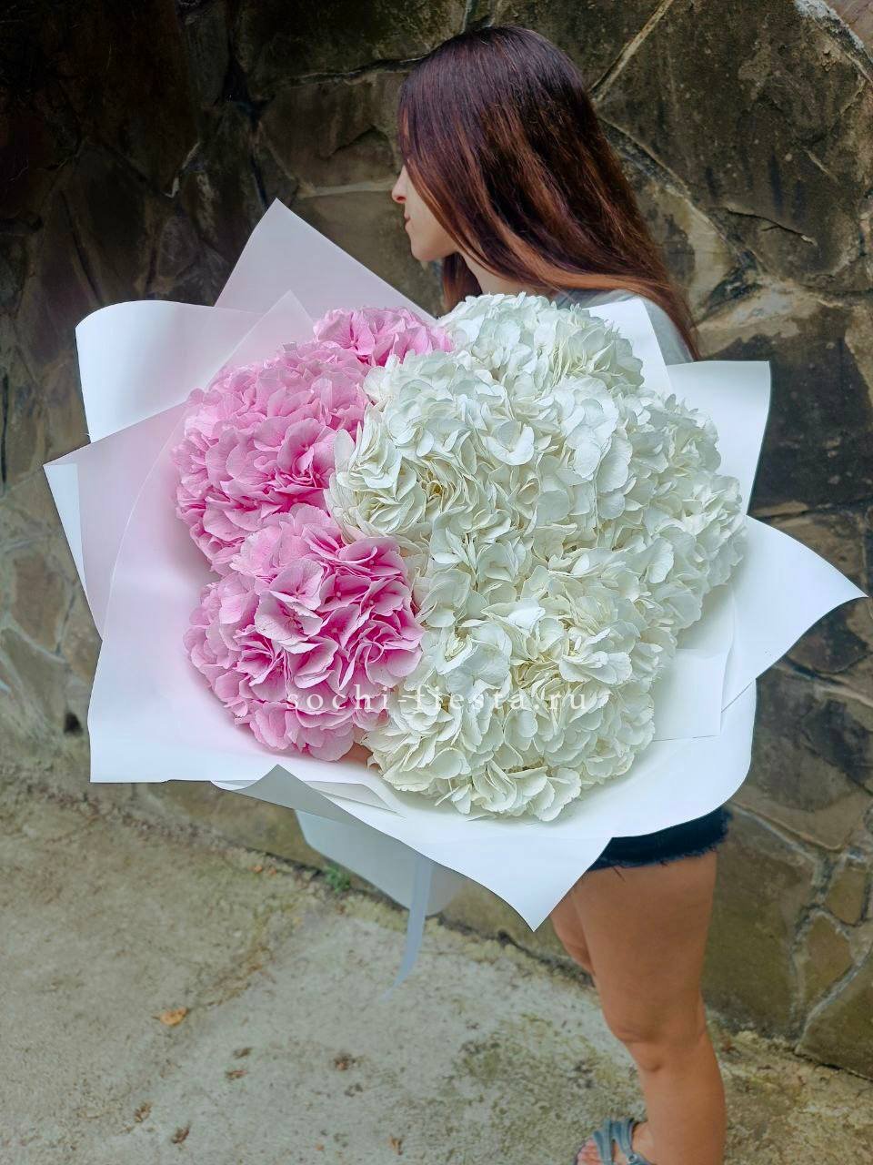 гортензия, лента, зелень по наличию, дизайнерская упаковка.