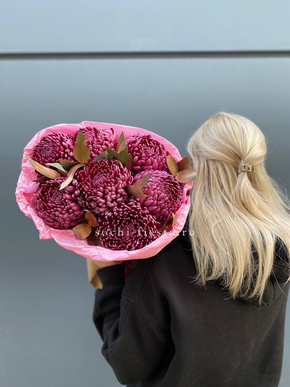 Семь пышных соцветий хризантемы с игривыми завитыми лепестками собраны в плотную композицию. Золотистый эвкалипт добавляет теплое мерцание и завершает образ. Яркий жест для тех, кто любит выразительные формы и живую энергию цветов.