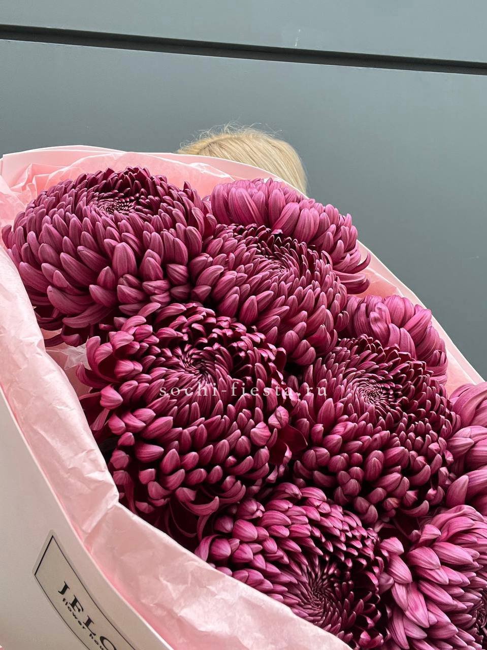 Девять хризантем бигуди выстраиваются в воздушную композицию с игольчатыми лепестками. Каждый бутон раскрывается лучистой звездой, создавая объёмную фактуру и динамичный силуэт.