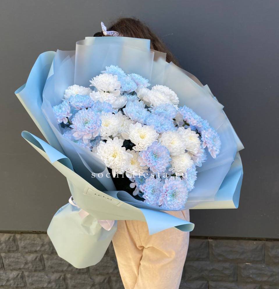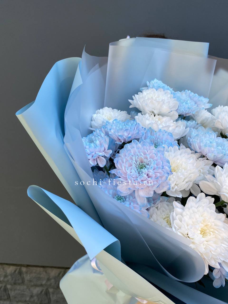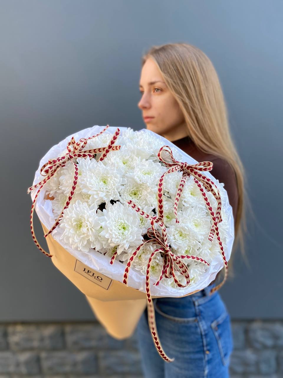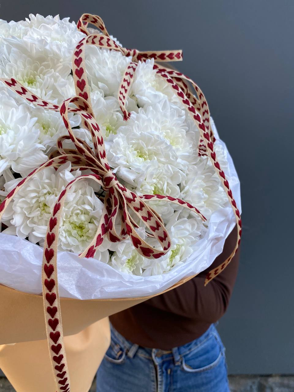 минимальный состав: 7 одноголовых хризантем, лента, упаковка на выбор.