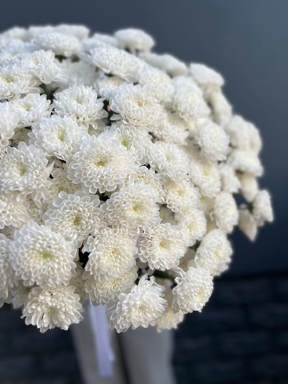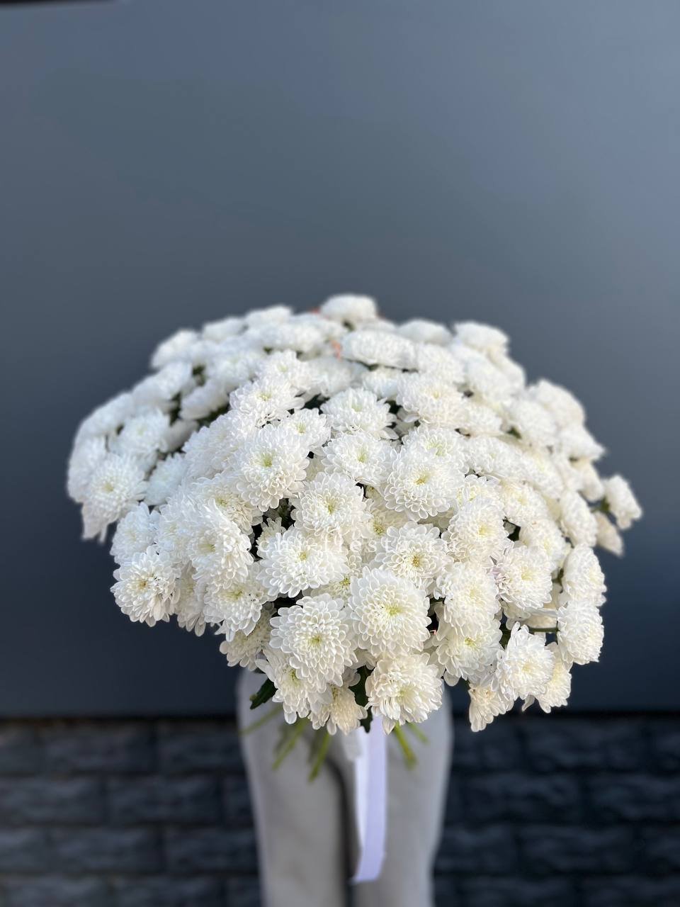 Сиреневая гамма с переходом в розовый создаёт мягкую дымку соцветий. Кустовые хризантемы собраны в плотную шапку, где каждая ветка раскрывается своим ритмом. Монохромная композиция для тех, кто ценит спокойную красоту.