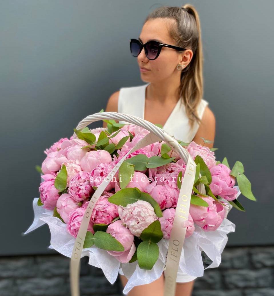 29 пионов, эвкалипт, корзина, лента.