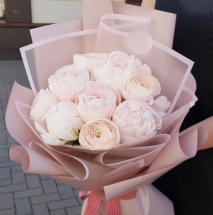 пионы, ранункулюсы, дизайнерская пленка, лента.