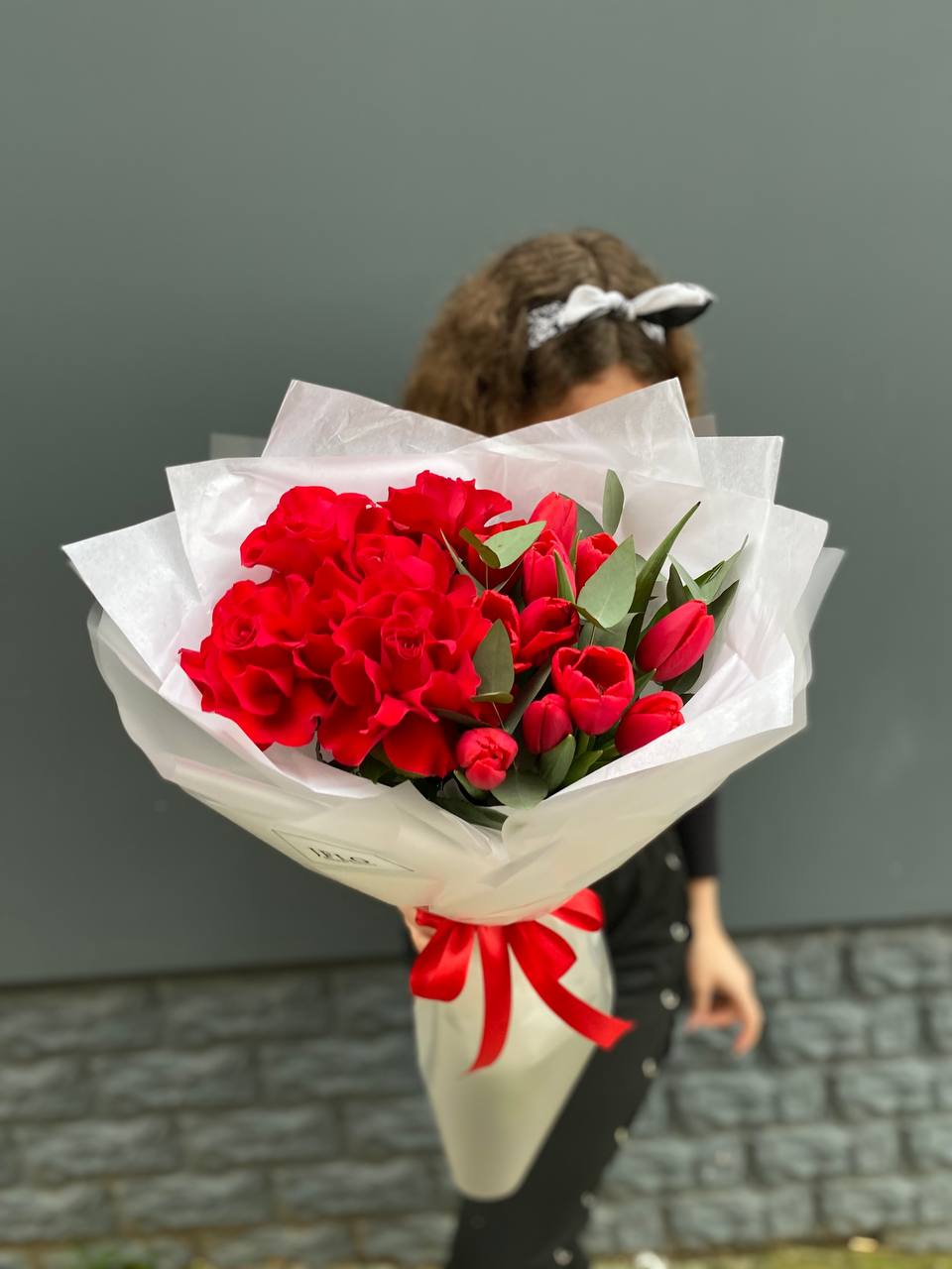 Пятнадцать бутонов собраны в плотную группу и упакованы в прозрачную пленку. Красный оттенок лепестков создает яркое цветовое пятно, которое сразу привлекает внимание. Тюльпаны сохраняют свежесть долго и не требуют сложного ухода.