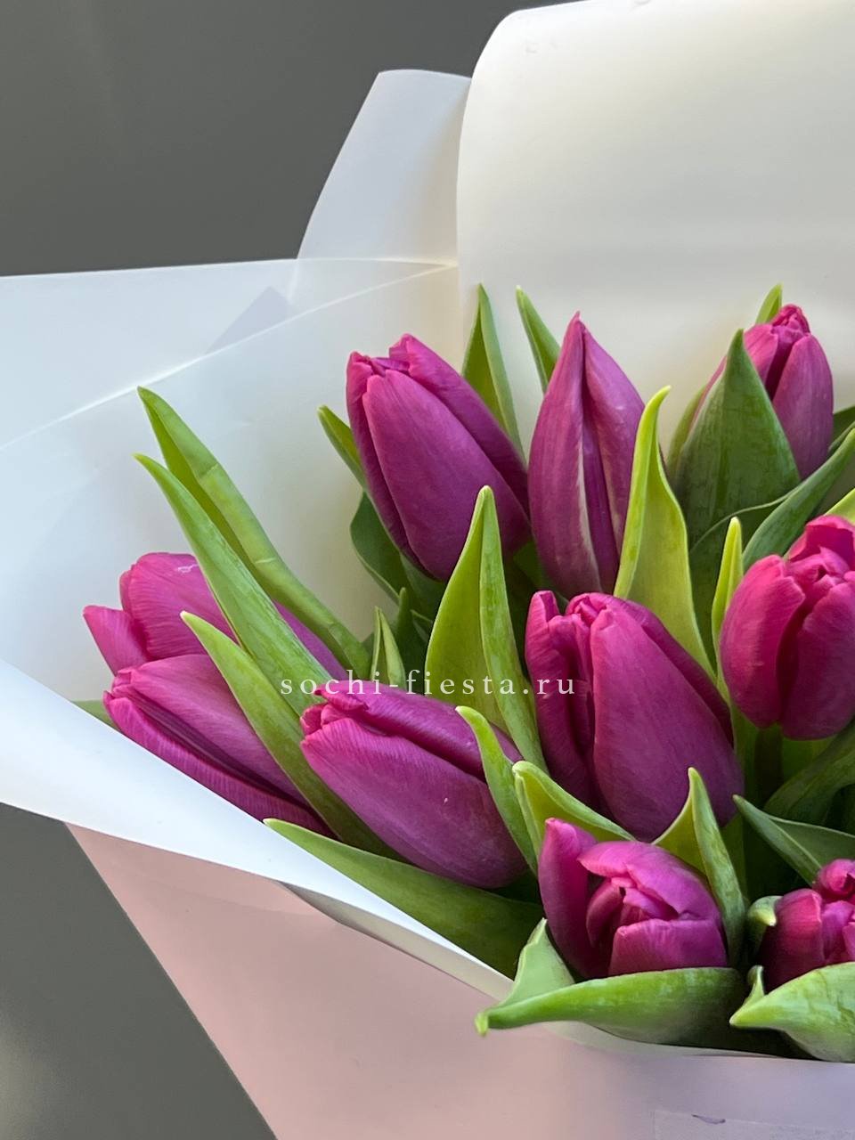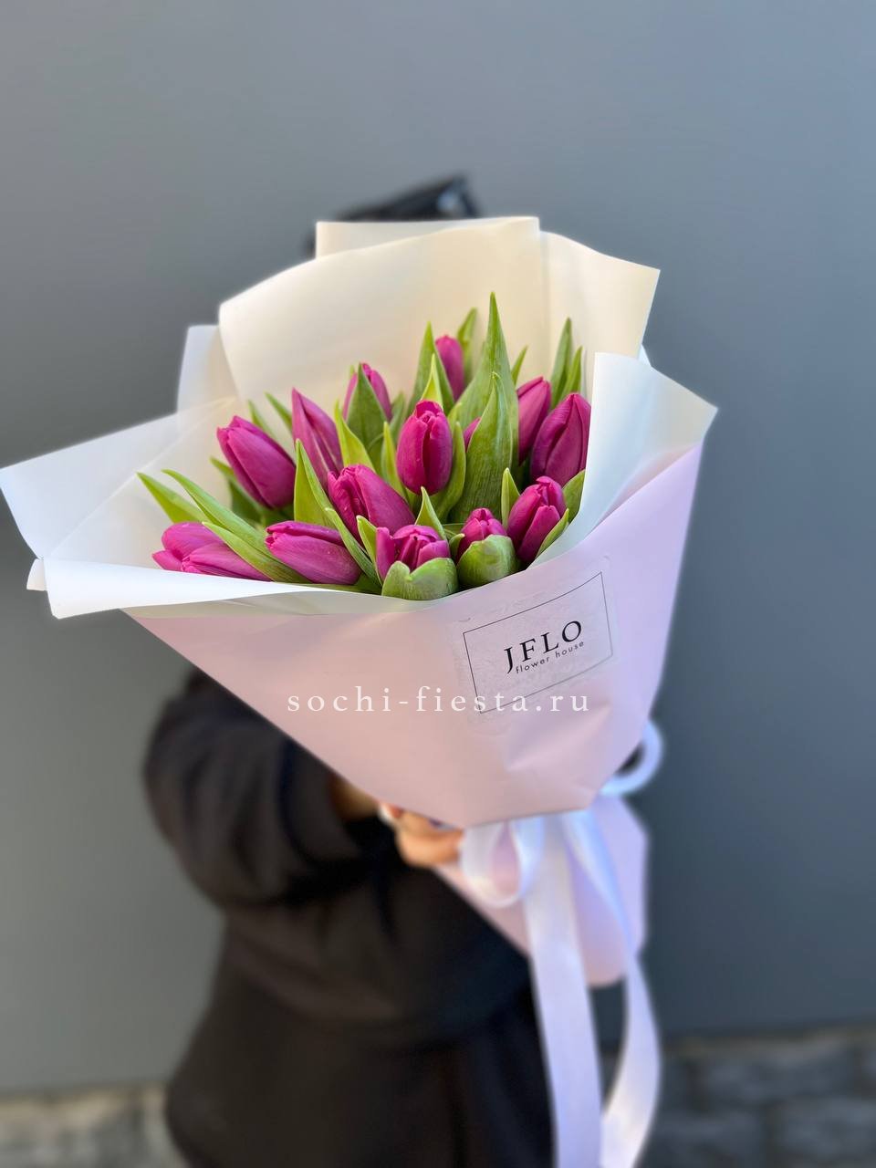 Пятнадцать бутонов насыщенного винного оттенка собраны в плотную вертикальную композицию. Глубокий пурпурный тон создает яркое цветовое пятно в любом интерьере.