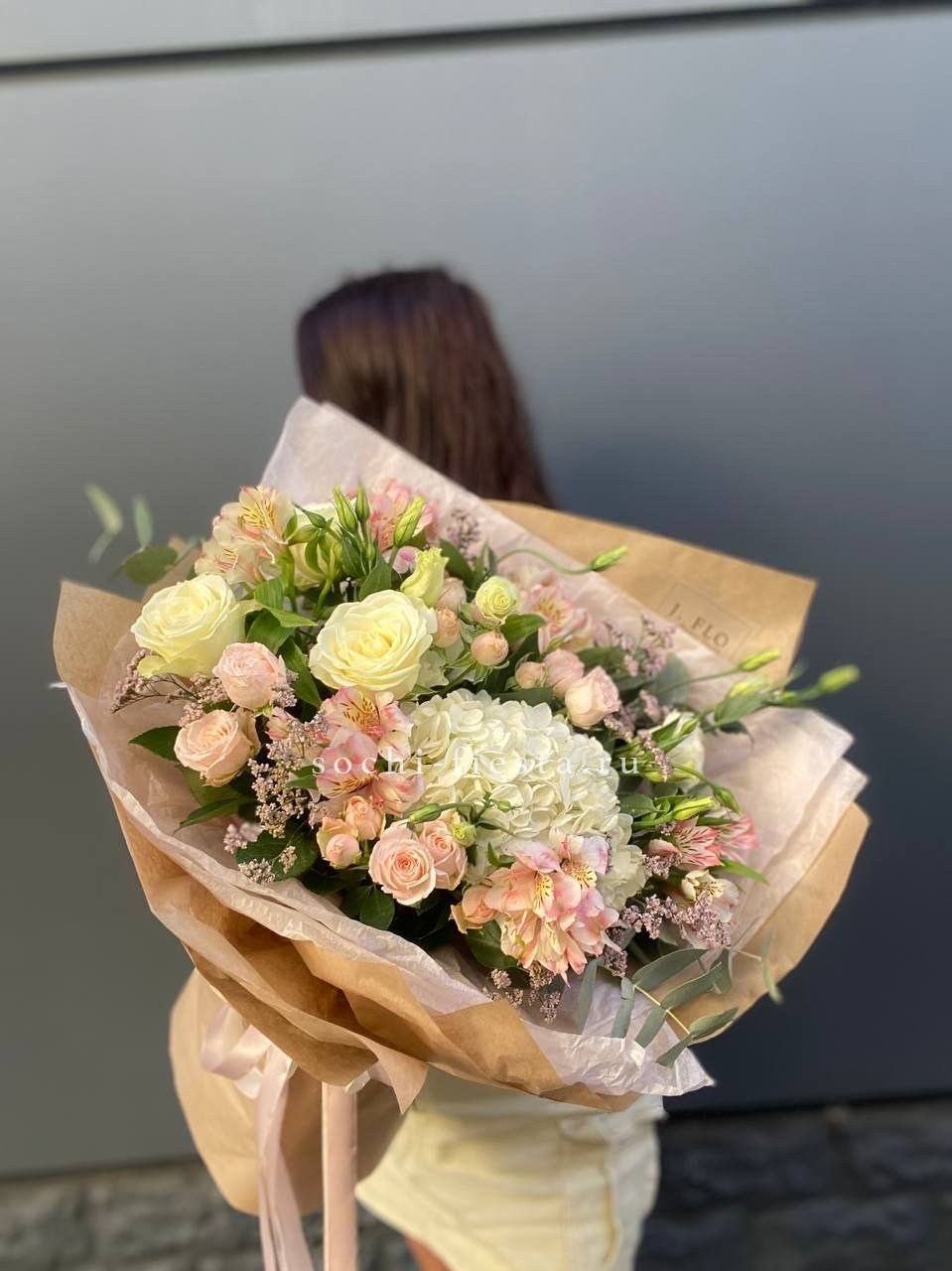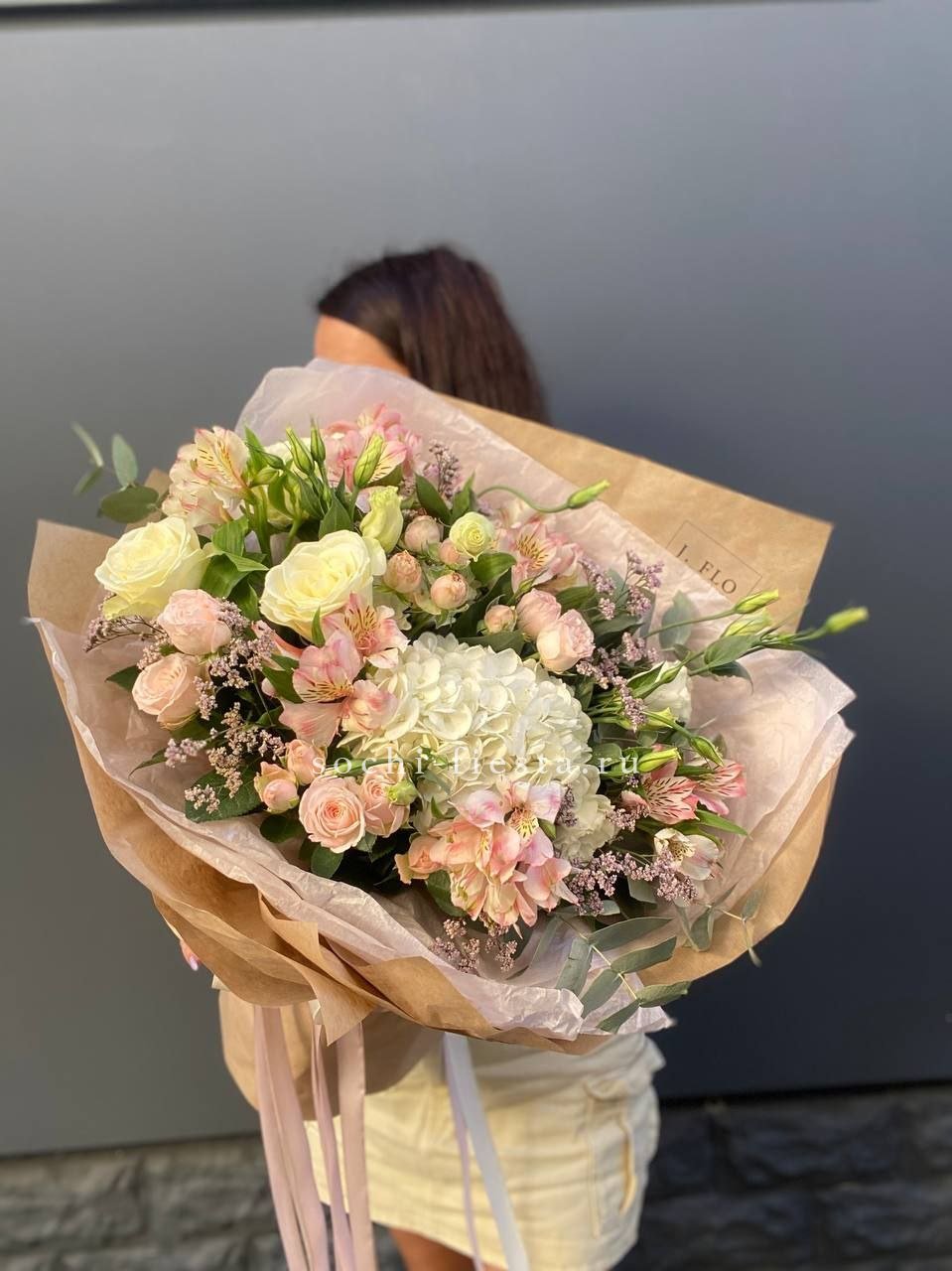 гортензия, диантус, кустовая пионовидная роза, эустома, орхидеи (или аналог), эвкалипт, лента, дизайнерская упаковка.