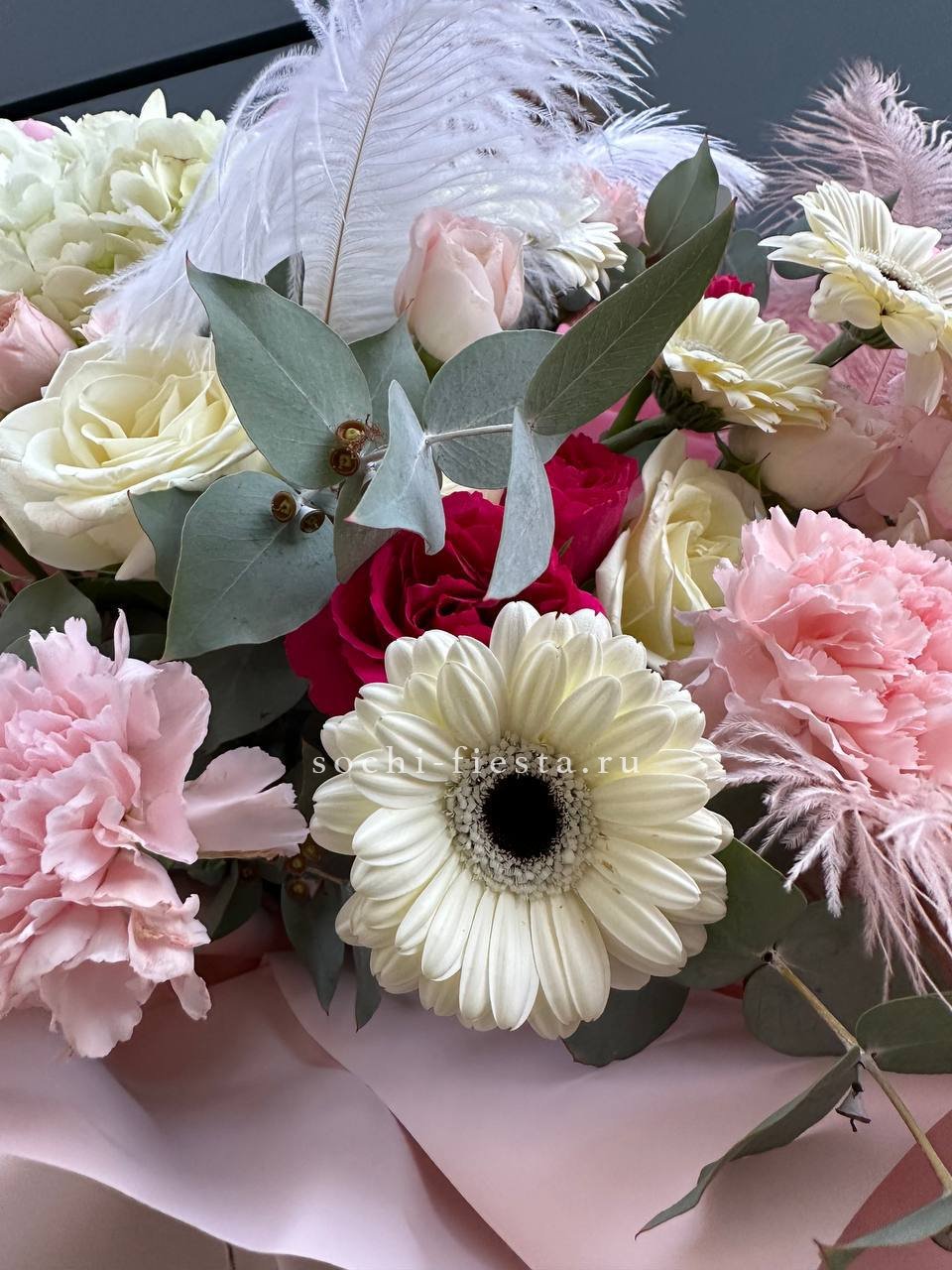 гортензии, роза одноголовая, роза кустовая, гербера, озотамнус, диантус, эвкалипт, декоративные перья, лента, дизайнерская упаковка.
