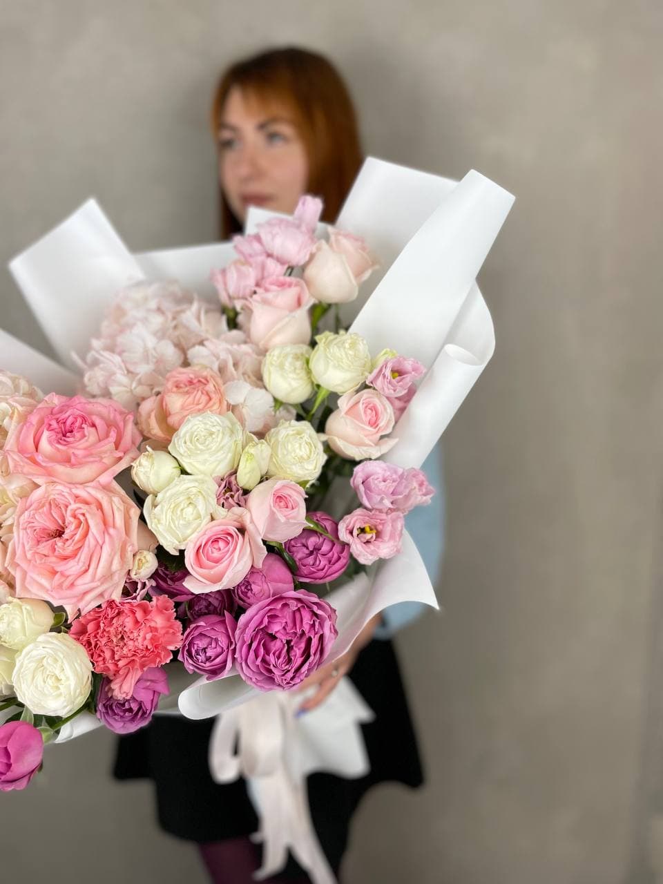 Плавные линии пышных соцветий гортензии переходят в округлые формы пионовидных роз и воздушные бутоны эустомы. Диантусы добавляют графичности, а дизайнерское оформление задает общий ритм композиции. Букет для пространств с характером.