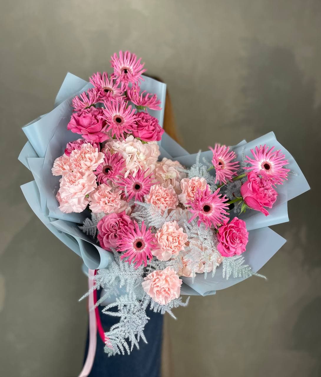 Пионовидные розы и крупные соцветия гортензии создают объёмную текстуру с мягкими переходами оттенков. Экзотическая гербера и диантус добавляют графичности, а воздушный аспарагус разбивает плотность композиции лёгкими штрихами.