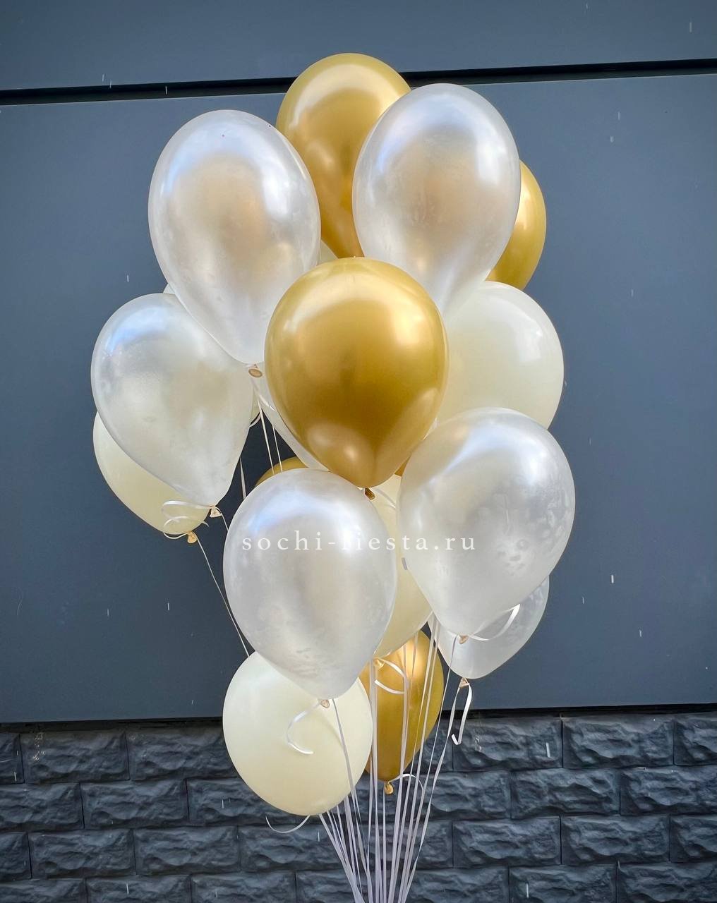 облако из 7 шт. хромированных золотых шаров, 7 шт. шаров белого цвета, 6 шт. шаров нежно-розового или кремового цвета, а также грузика. Все шары мы предварительно обрабатываем специальным составом Highfloat, обеспечивая им длительный срок полета.