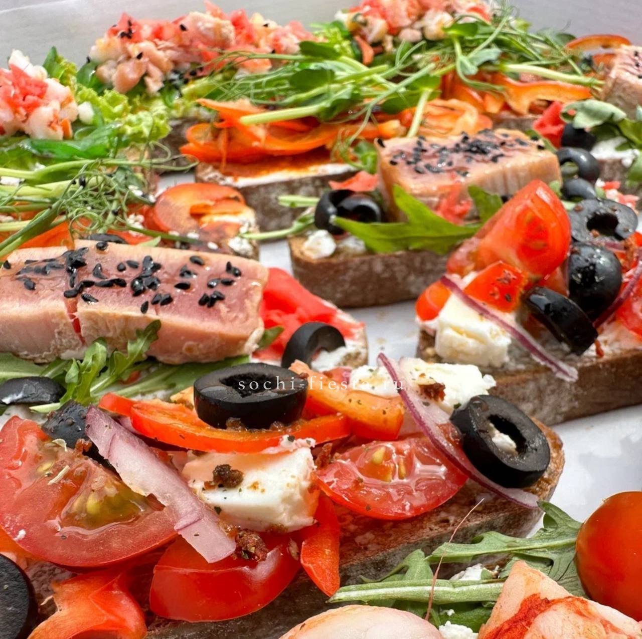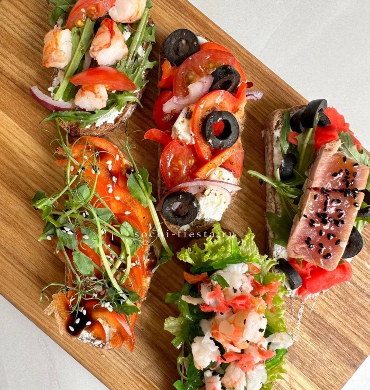 с говядиной и вялеными помидорами- 4 шт. С нежным сливочным паштетом из куриной печени- 4 шт.С семгой и огурцом на крем чиз- 4 шт. С карбонадом, черри и салатом- 4 шт.