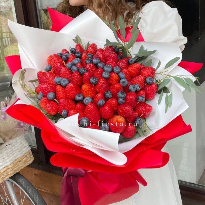- Ягодный букет — клубника на шпажках в форме букета с живыми цветами.