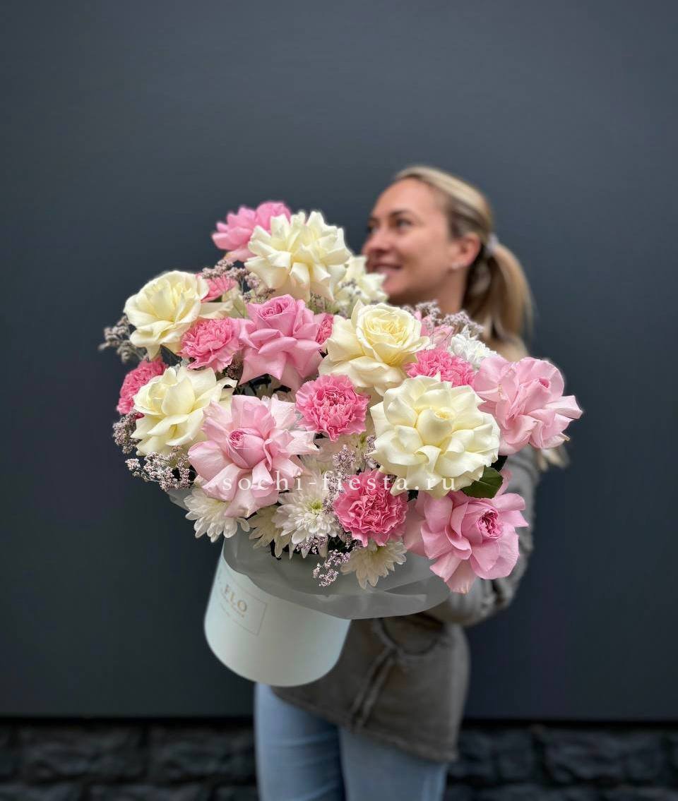 Для заказа товара "Коробка французских роз и диантусов "Бони"" с доставкой в Нальчике нажмите в корзину