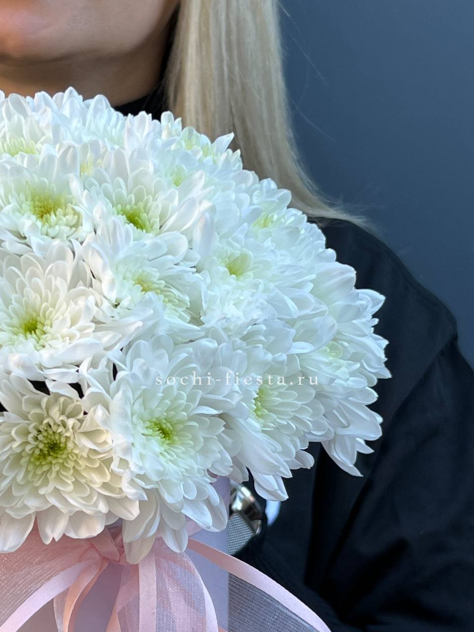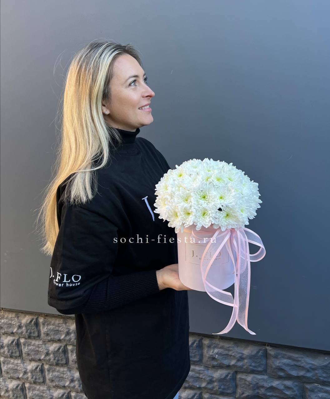 Хризантемы собраны в плотную округлую форму и помещены в аккуратный бокс. Компактное решение для рабочего стола или небольшой полки.