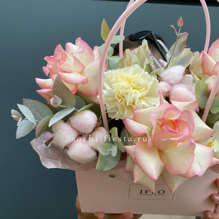 Коробка в студии Нальчике — плотный картон с матовой поверхностью, иногда с тиснением логотипа. Внутри — флористическая губка (оазис), предварительно пропитанная водой. Сверху — атласная или шёлковая лента, декоративная тесьма, иногда фирменная открытка.