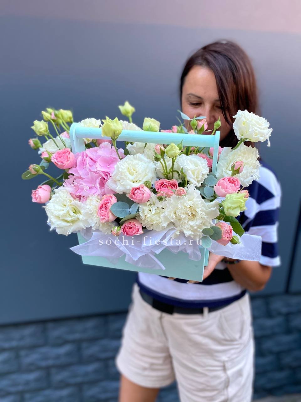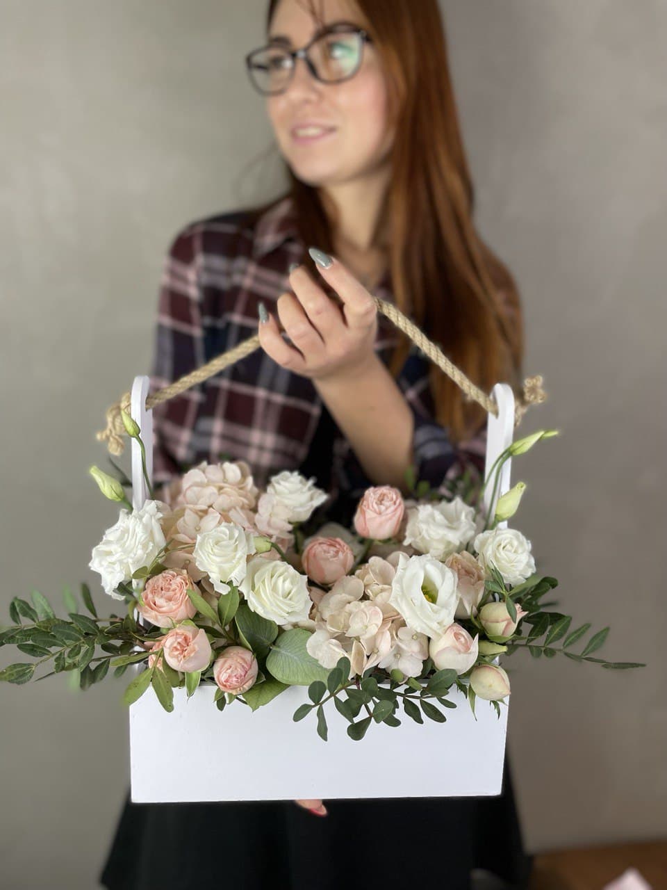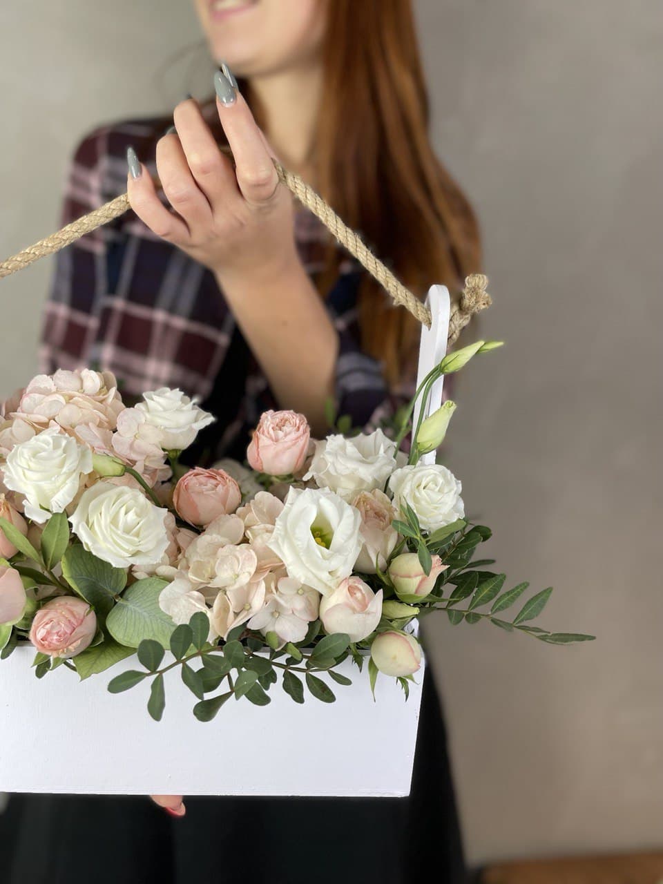 цветочная композиция в нежно-кремовых тонах с применением орхидеи, эустомы, пионов и других цветов, деревянный ящик, лента.