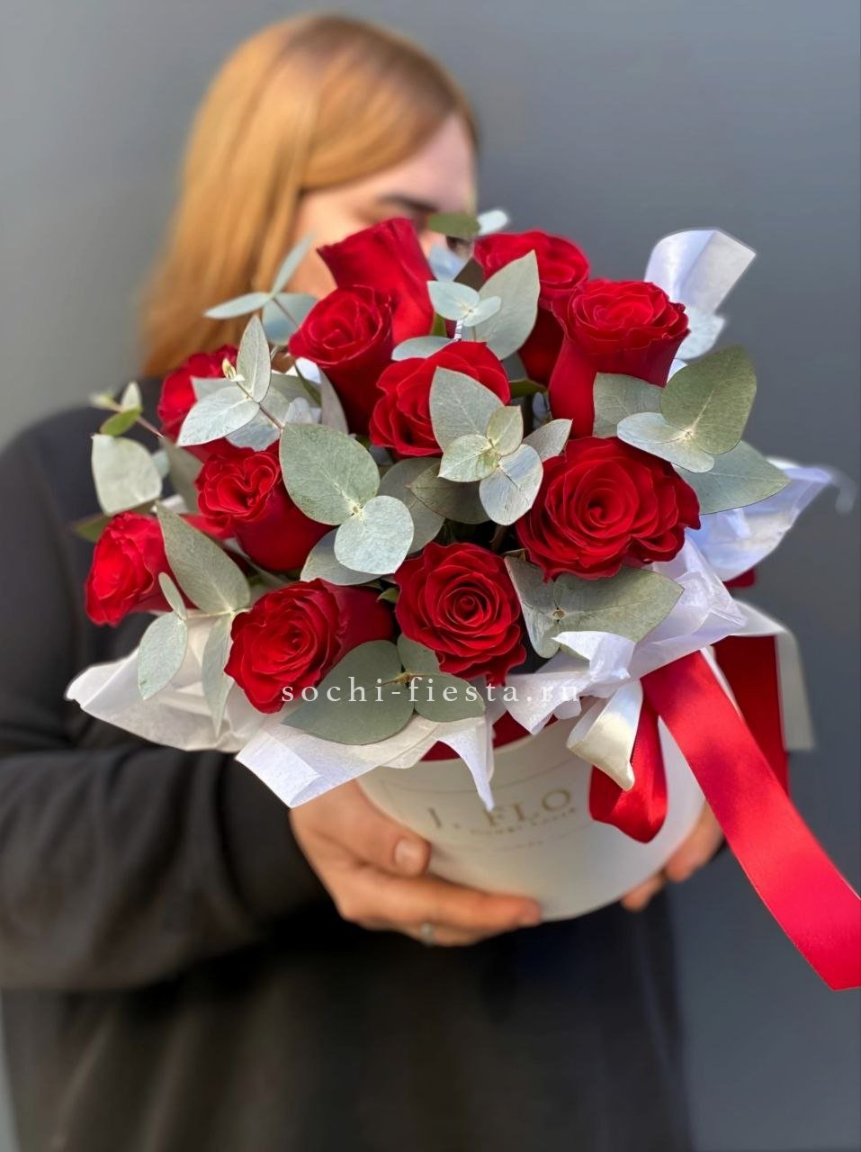 красных роз, эвкалипт, цилиндр.