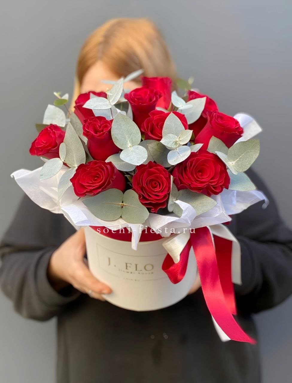 Одиннадцать красных роз выстроены в цилиндре ровным силуэтом. Эвкалипт окружает бутоны по краю и подчеркивает графичность композиции.