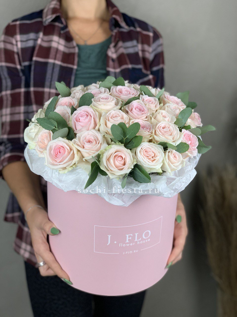 нежно-розовые розы, эвкалипт мини, цилиндр D20-25.