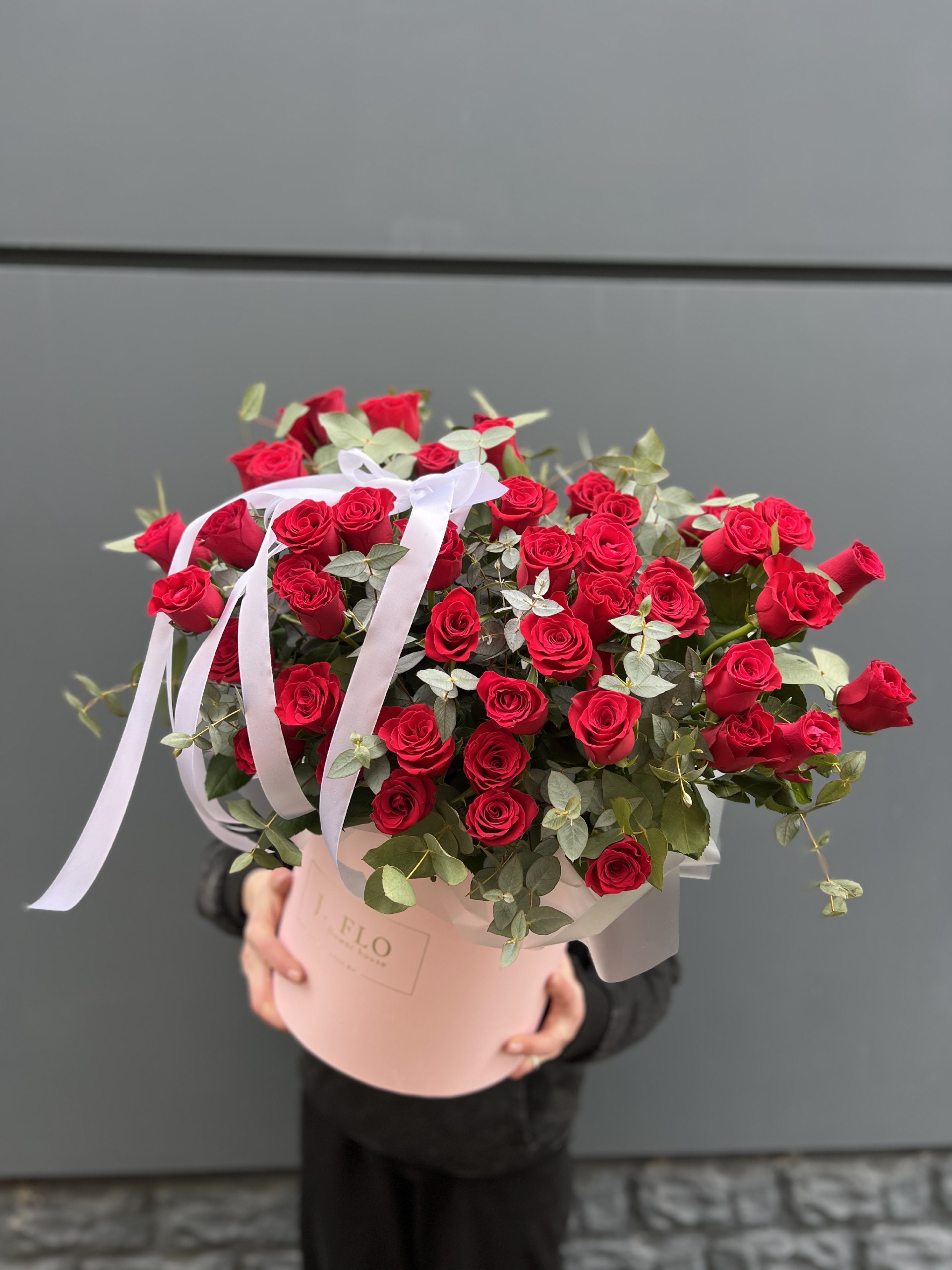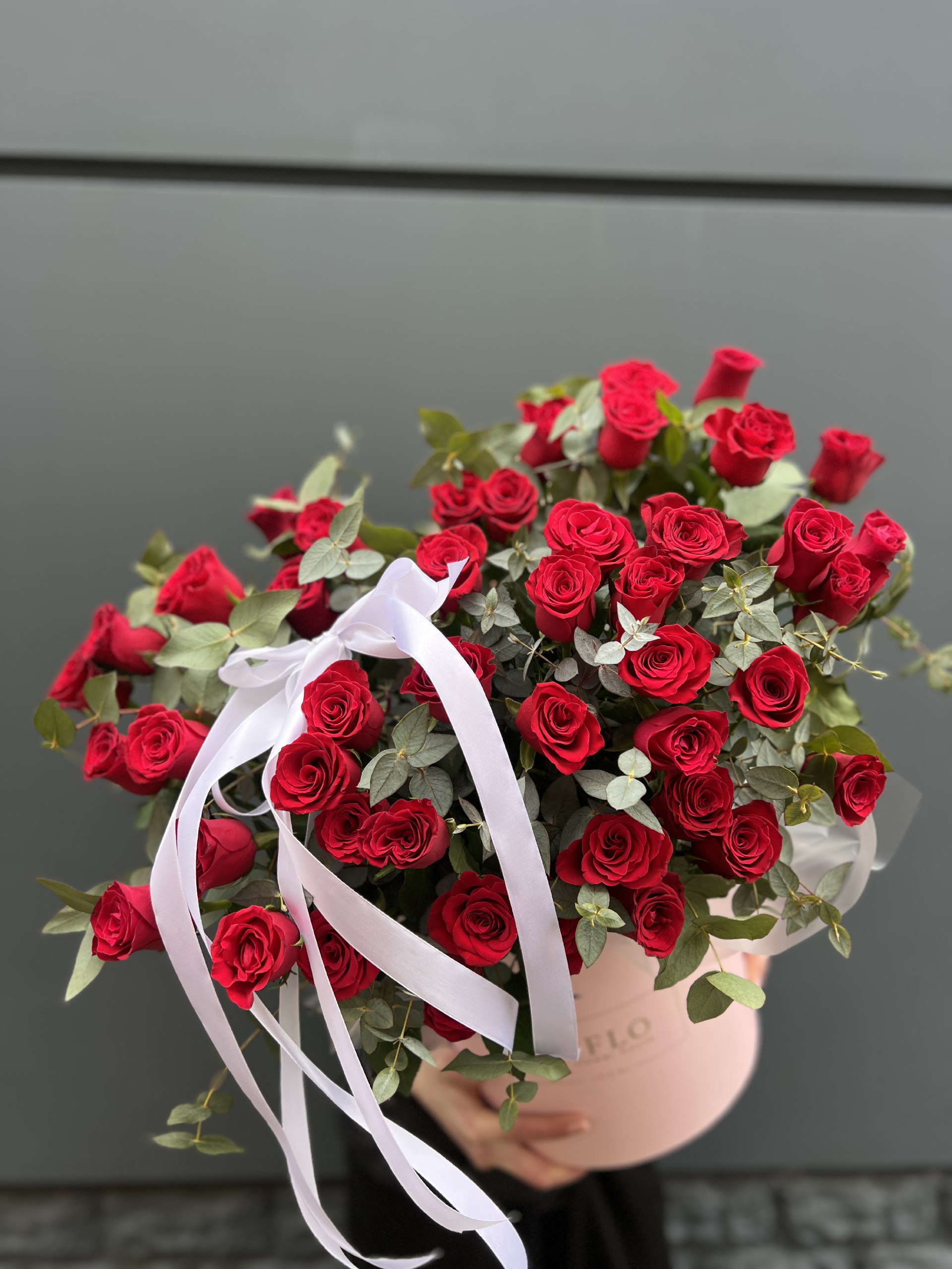 Тридцать пять бутонов розового оттенка выстраиваются в ровный купол. Эвкалипт мини проходит между розами и освежает композицию. Цилиндр сохраняет воду и позволяет цветам оставаться свежими.