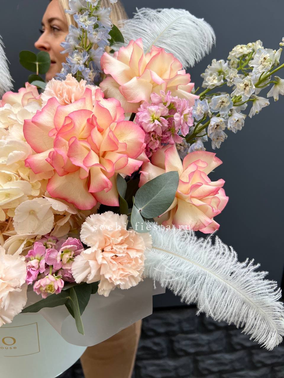 вывернутые  розы Джумилия, дельфиниум , гортензия, диантус, маттиола, цилиндр D20, эвкалипт, лента, упаковка.