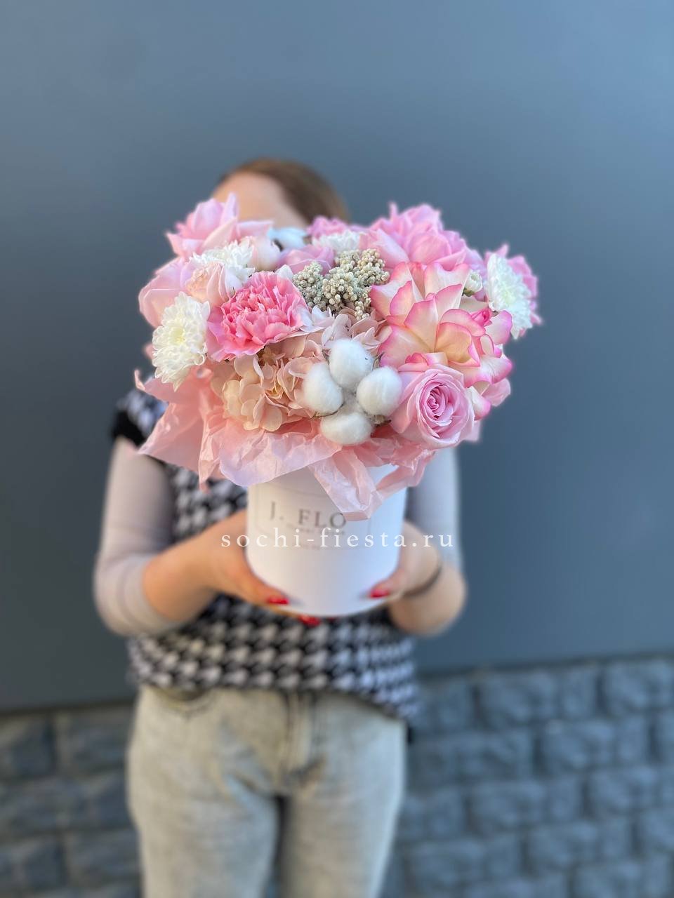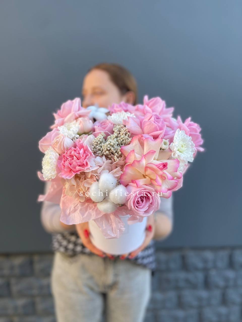 гортензия, французские розы, диантусы, эустома, цилиндр D20, эвкалипт, бумага тишью.