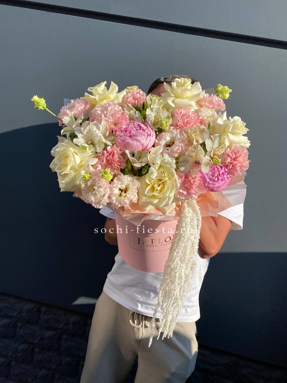 Цилиндр собран из пионов, роз и эустомы с добавлением диантусов и альстромерии. Амарант и эвкалипт создают объёмную текстуру. Композиция выразительна и хорошо держит форму.
