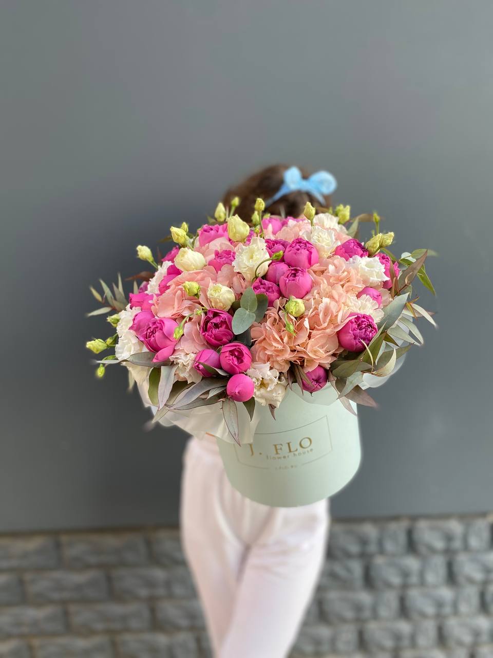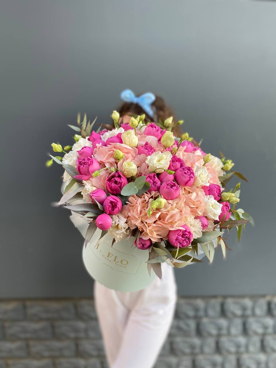 Масштабная композиция в цилиндре собирает пионовидные розы, гортензию и георгины в плотную объемную форму. Высота и диаметр создают выразительное присутствие в интерьере.