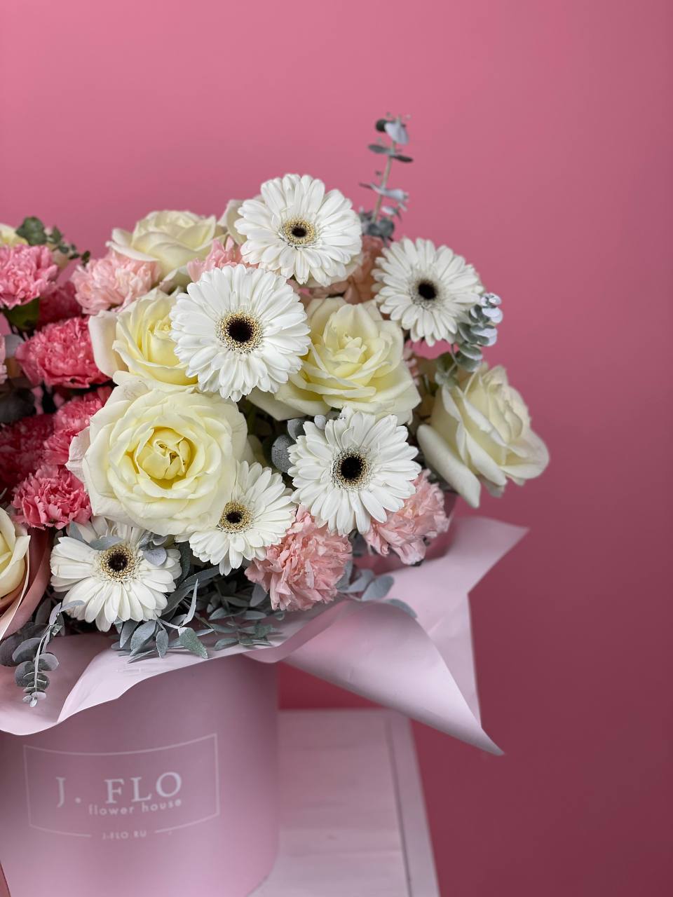 белые розы, диантусы, герберы, эвкалипт, бокс 20.