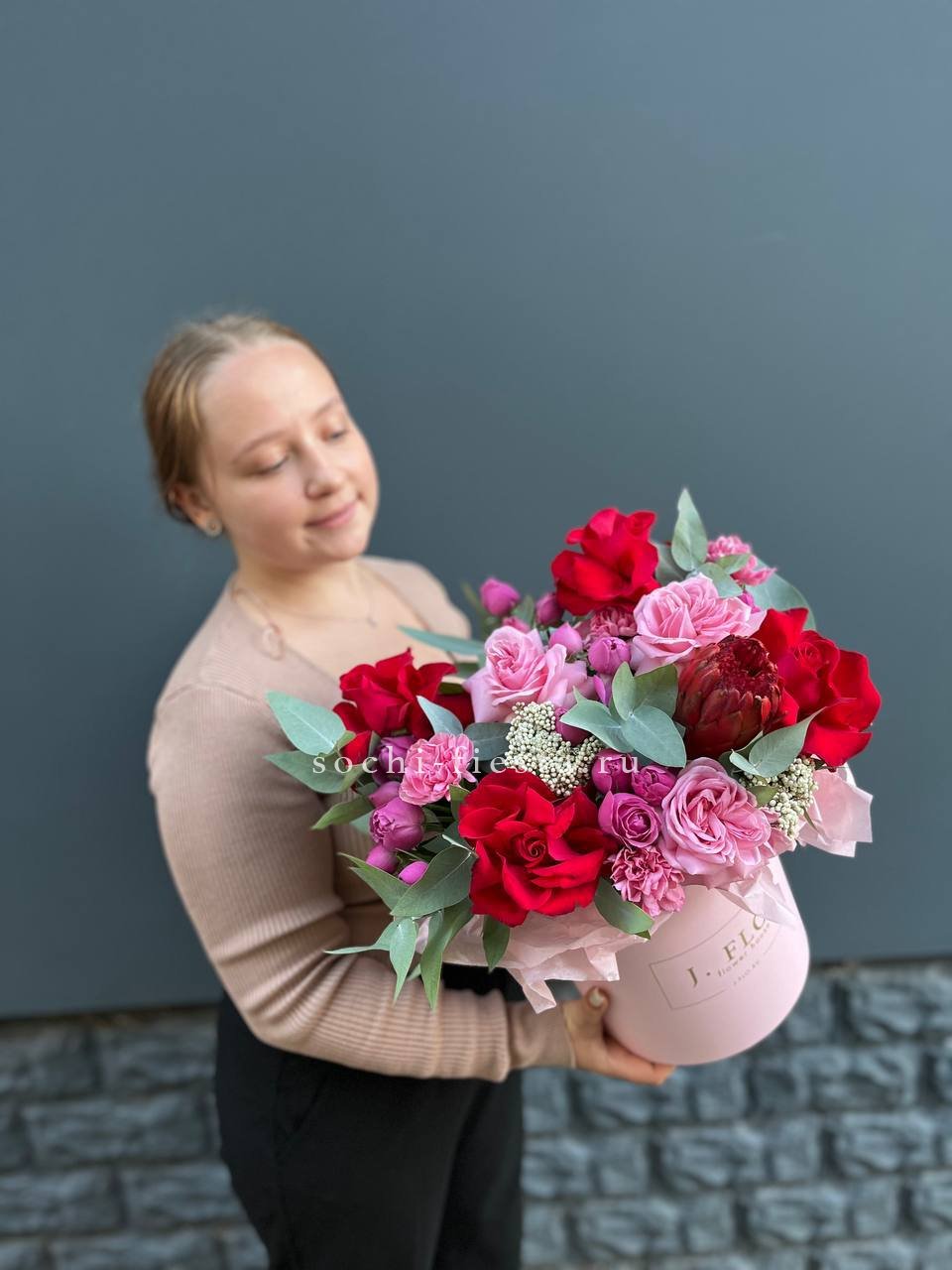 Масштабная композиция объединяет диантусы, антиринумы и розы разных сортов в единую структуру. Крупный бокс позволяет раскрыть каждый цветок в полную силу. Присутствие такой работы ощущается сразу.