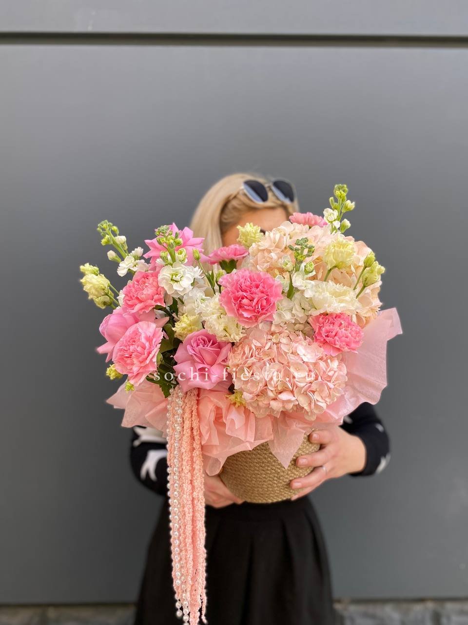 пионовидные розы Мисти Бабблс, джутовое кашпо, стифа, эвкалипт.