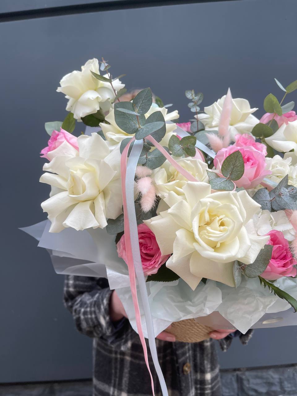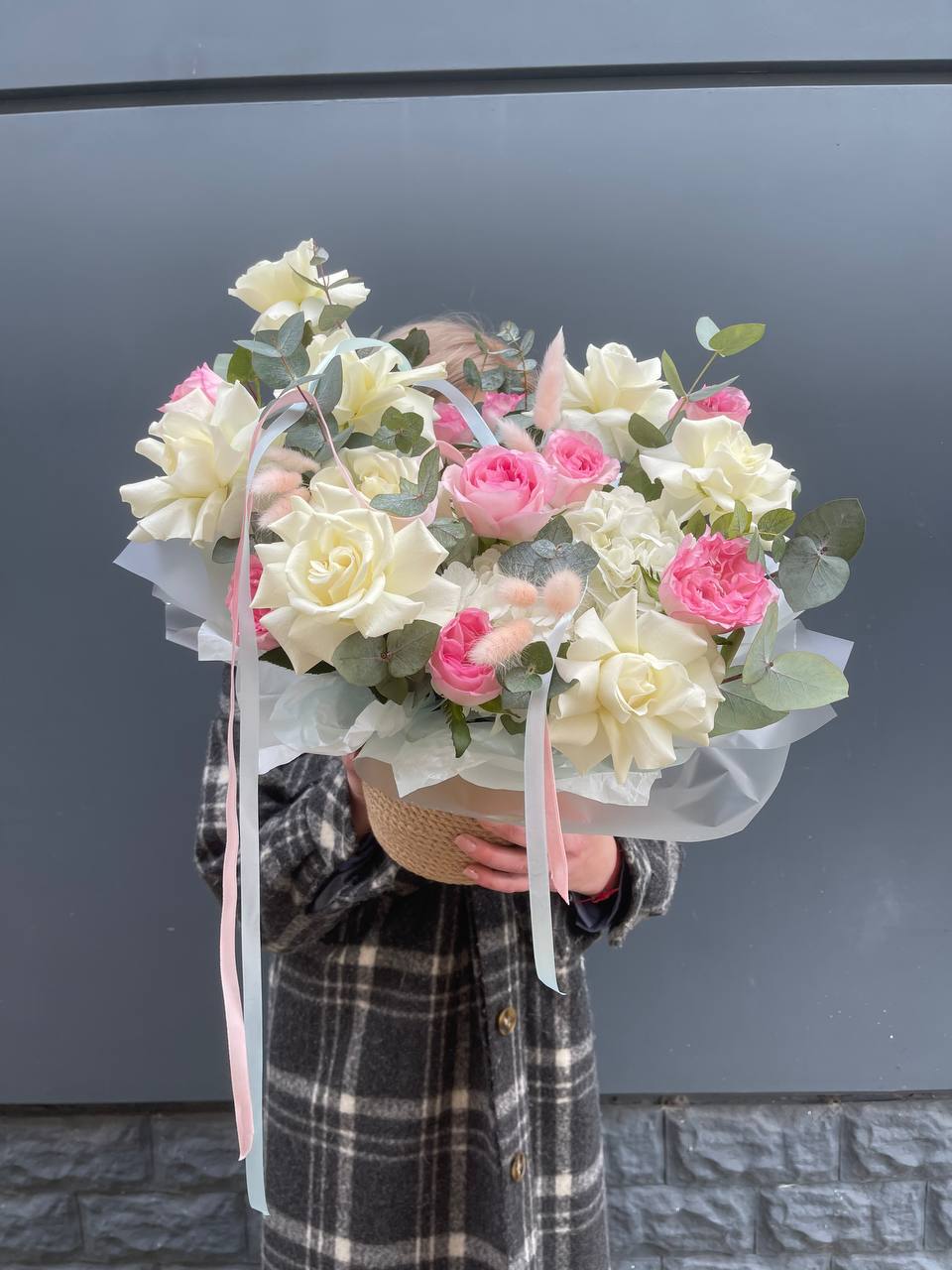 Пионовидные розы Мисти Бабблс с пышными многослойными бутонами создают объемную текстуру. Воздушная стифа и эвкалипт добавляют композиции легкости.