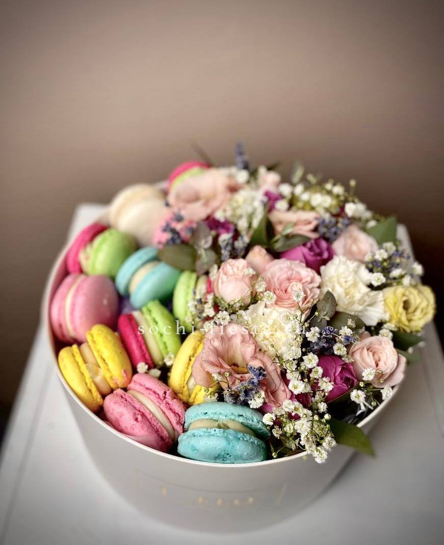 белые розы, альстромерии (по сезону) круглая коробка D20, 6 макаронс.