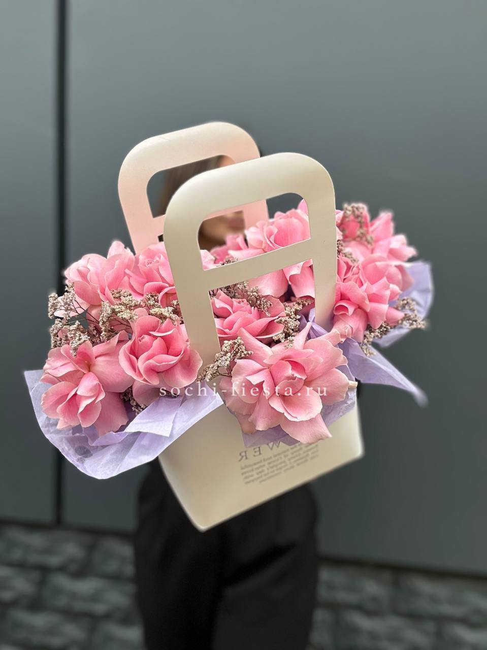 Розовые розы встречаются с орхидеей цимбидиум в объемной сумке-кашпо. Эустома и диантус создают многослойность, а кустовые розы заполняют пространство между крупными бутонами. Композиция держит форму и радует насыщенностью.