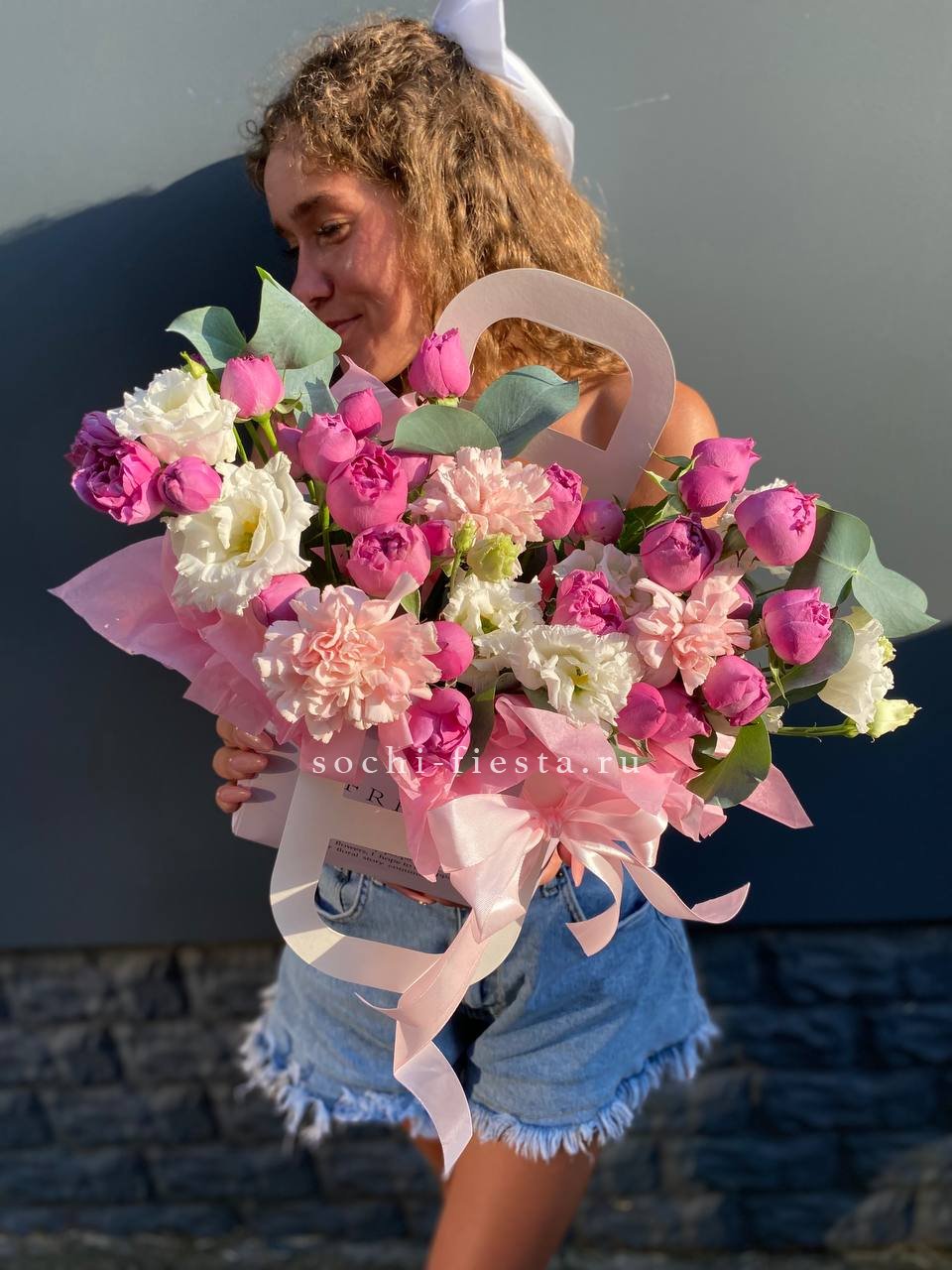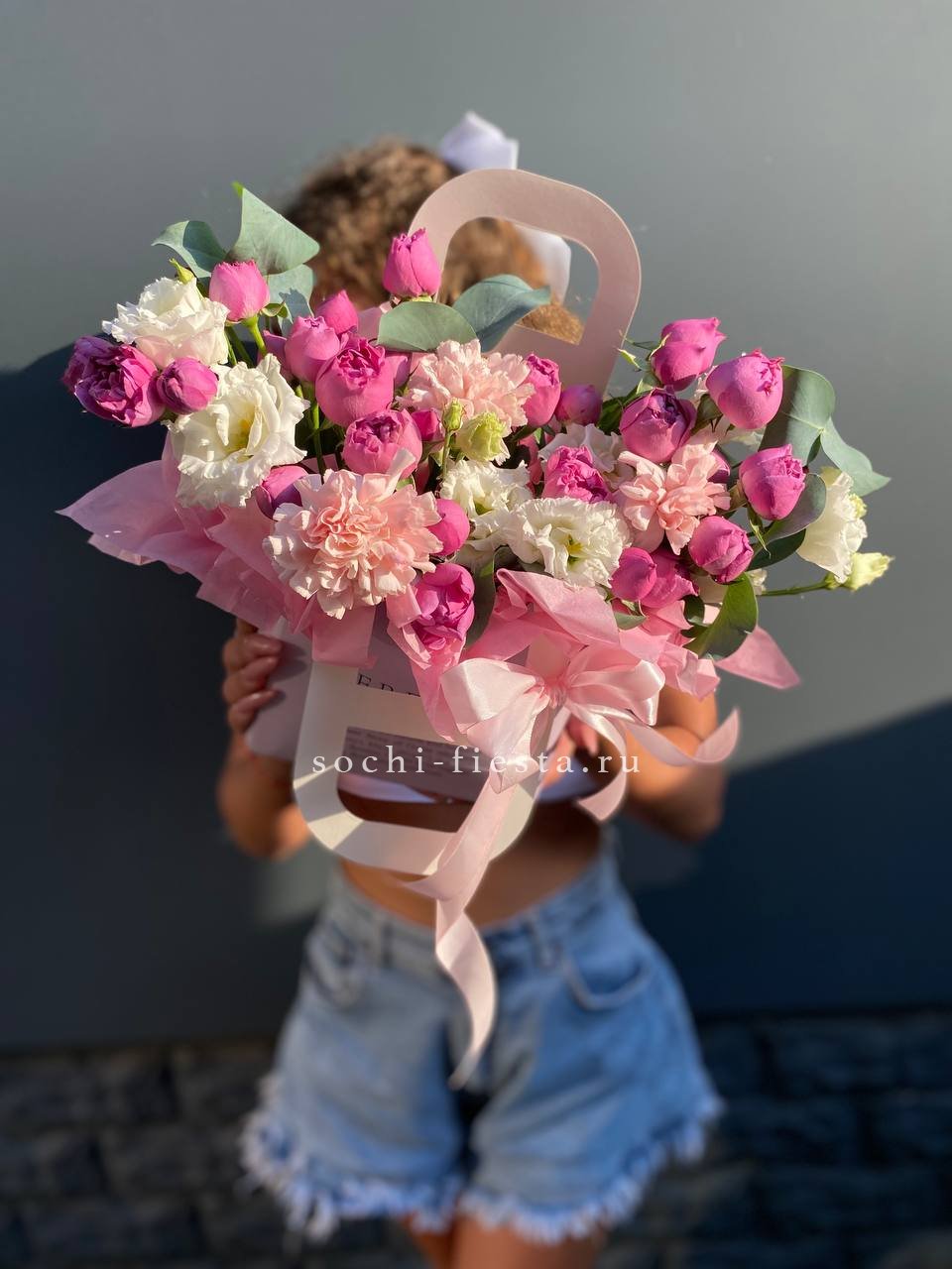 розовые розы, эустома, кустовые розы, диантус, орхидея цимбидиум или лилия, лента, сумка-кашпо.