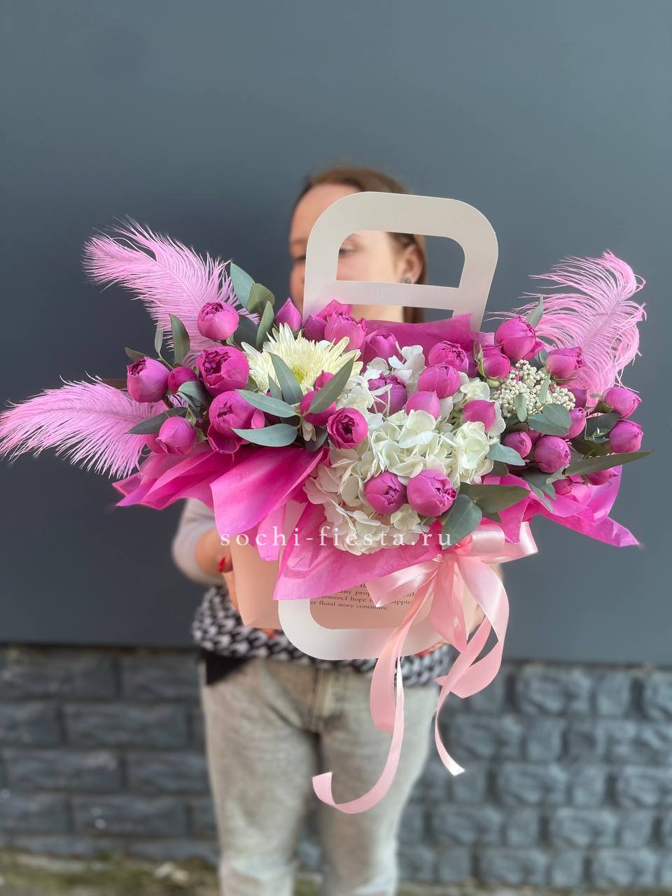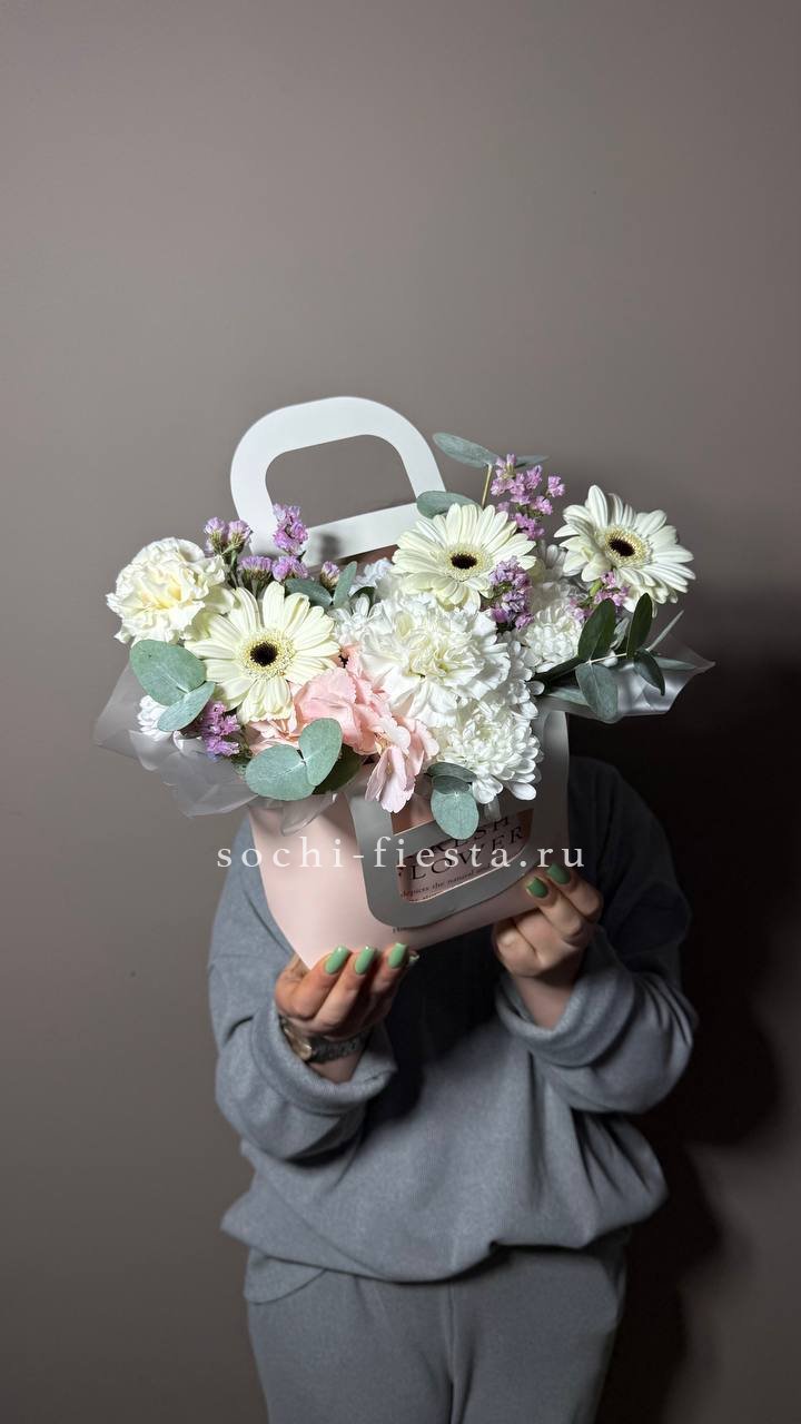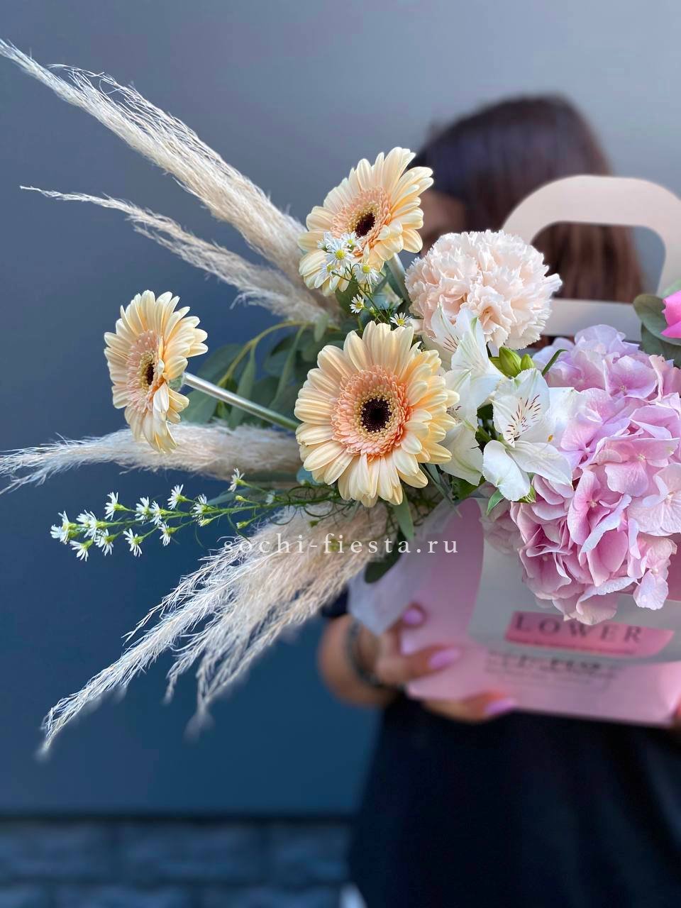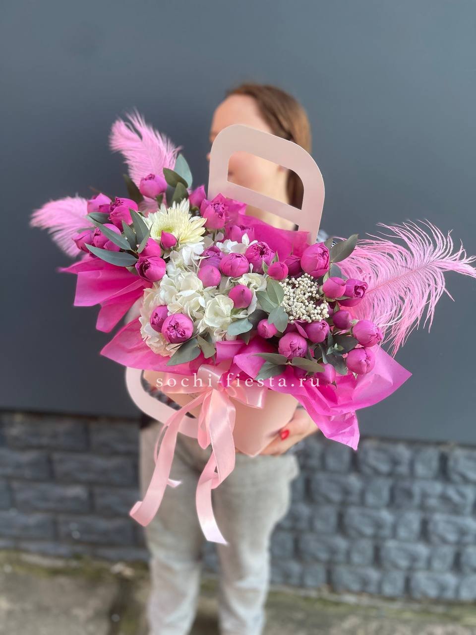 Воздушная композиция из диантусов и альстромерии в удобном формате. Цветы на оазисе держат свежесть долго и не требуют сложного ухода.