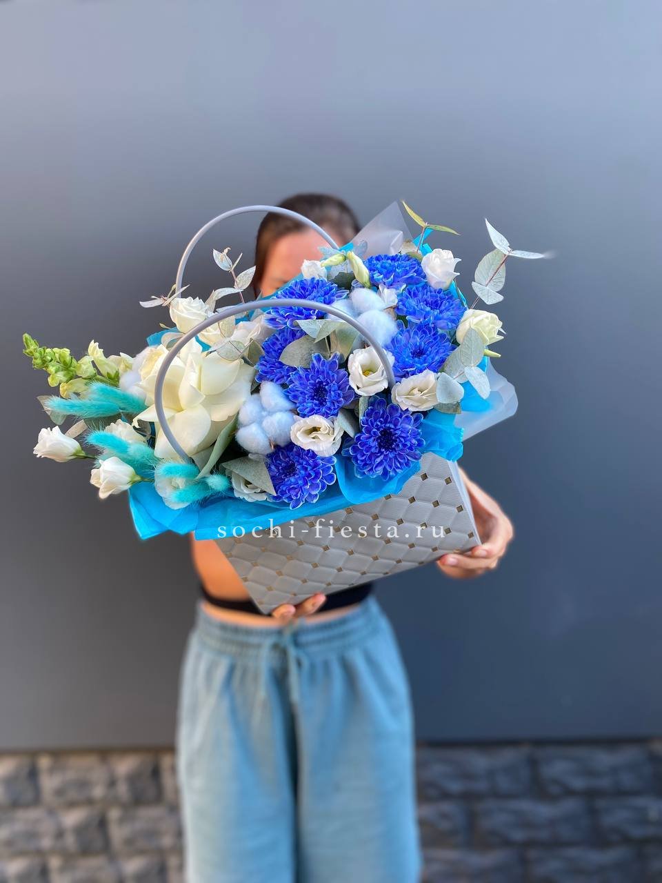 Яркая композиция в формате сумочки объединяет насыщенные герберы и белые розы. Бигуди добавляют графичности, эвкалипт завершает форму мягкими линиями.