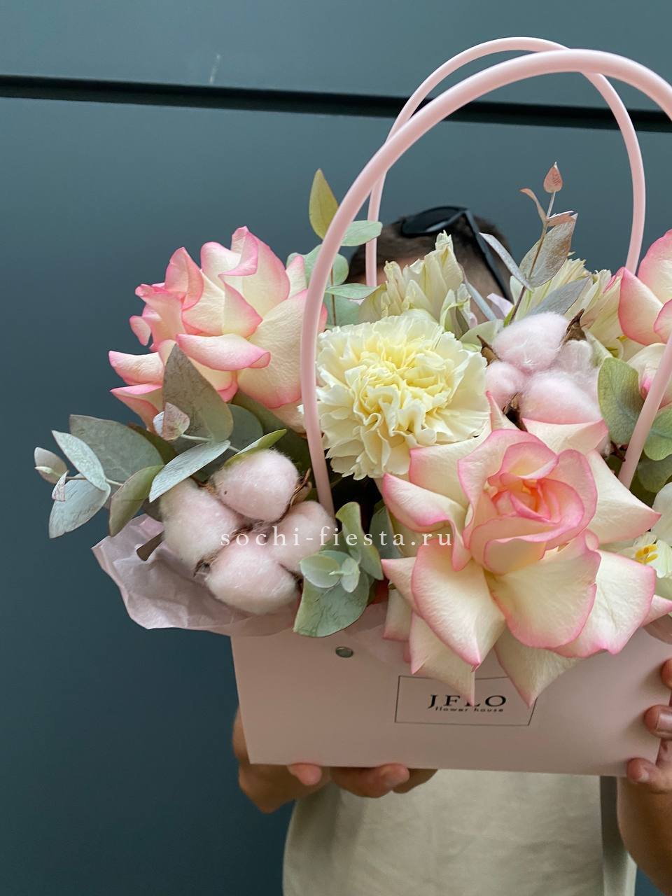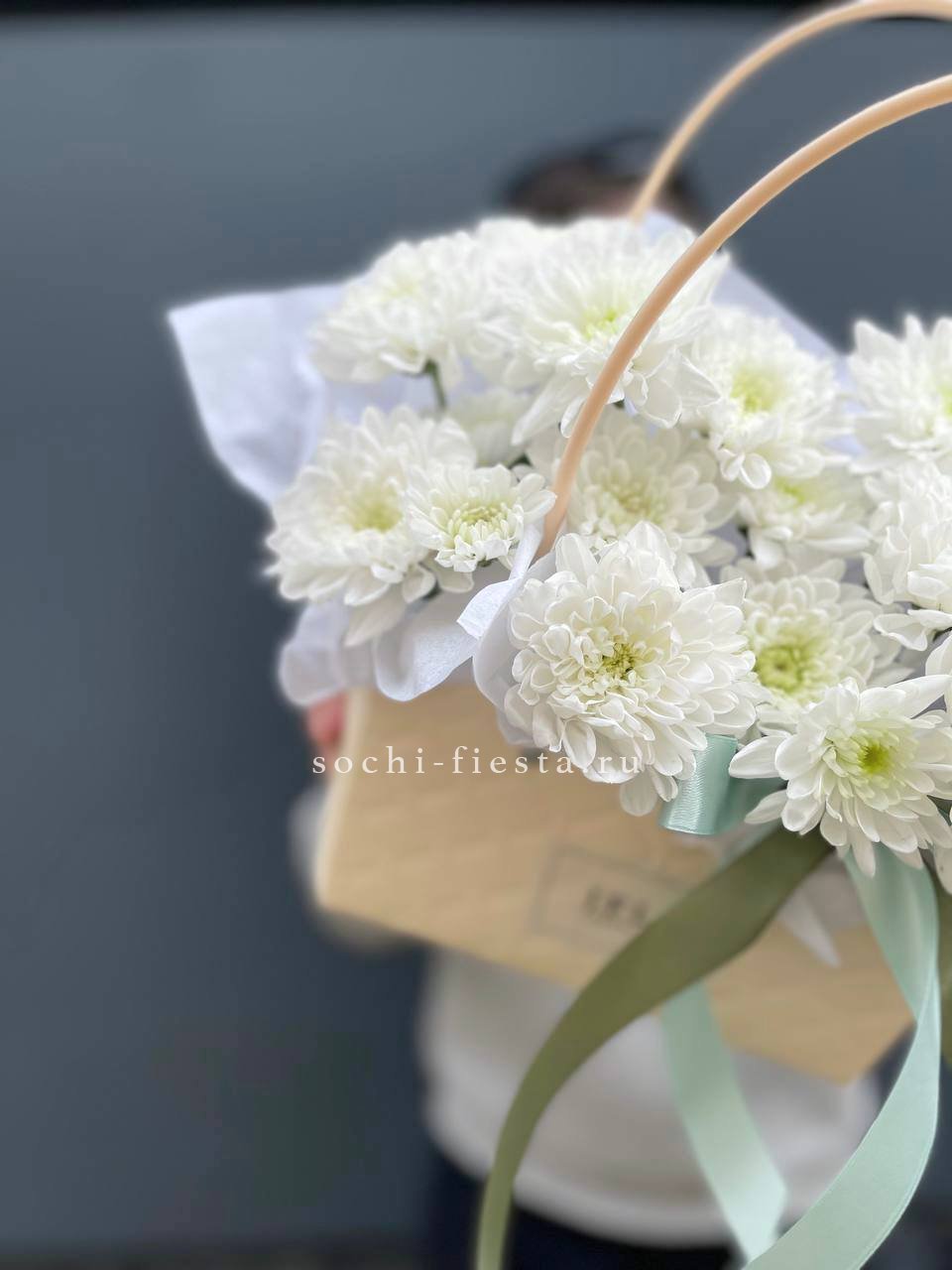 Компактная сумочка с кустовыми хризантемами создаёт уютное настроение. Живые соцветия собраны в удобной форме, которая легко размещается на столе или полке.