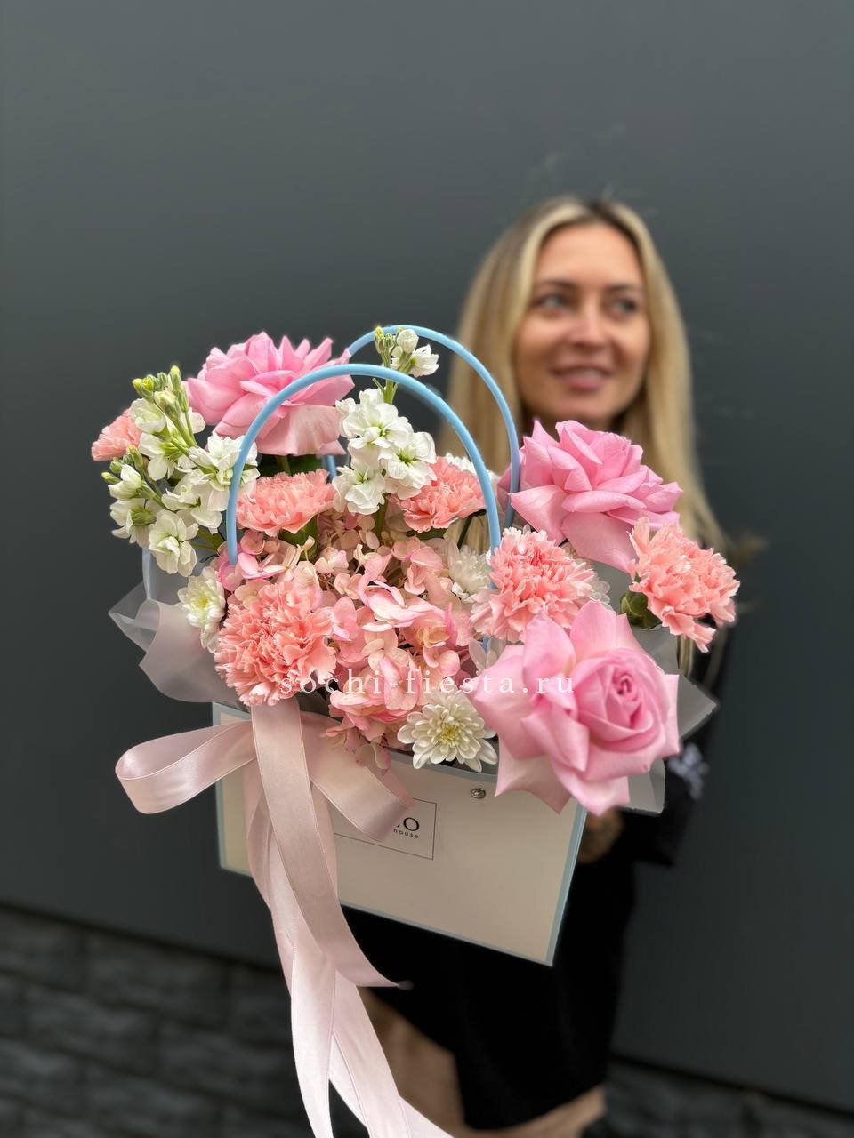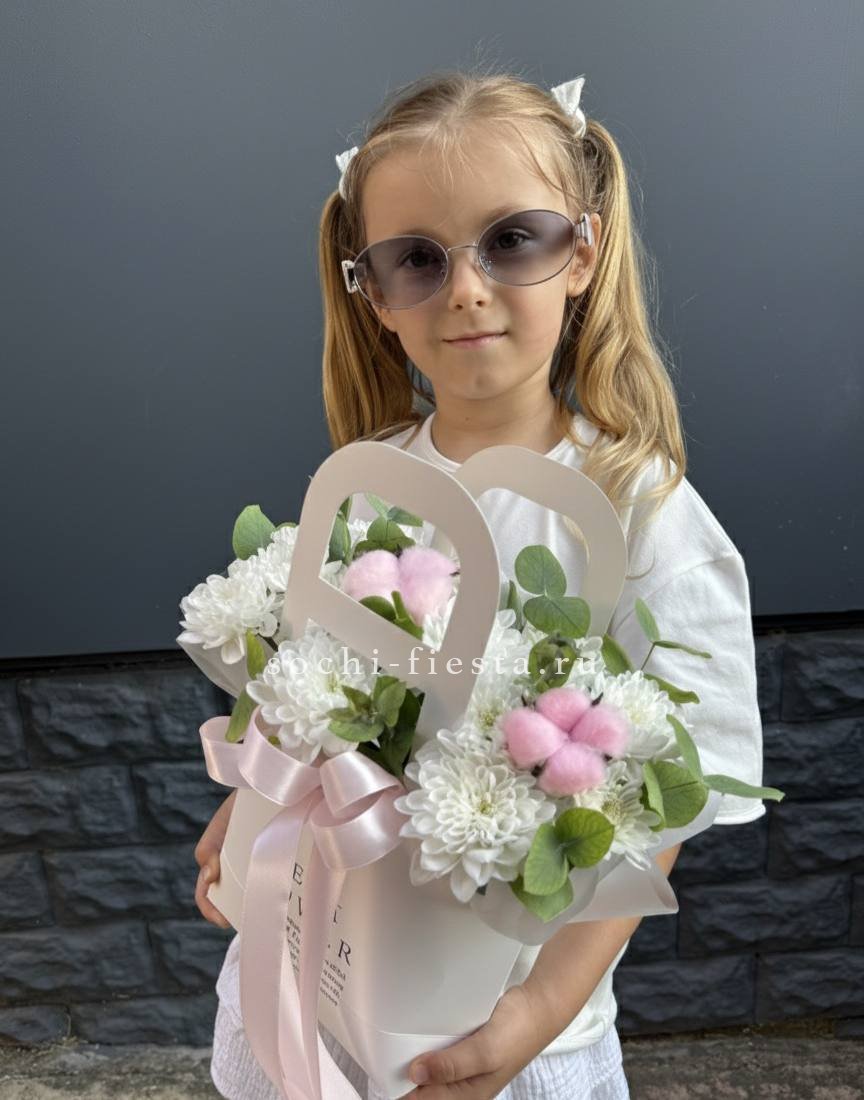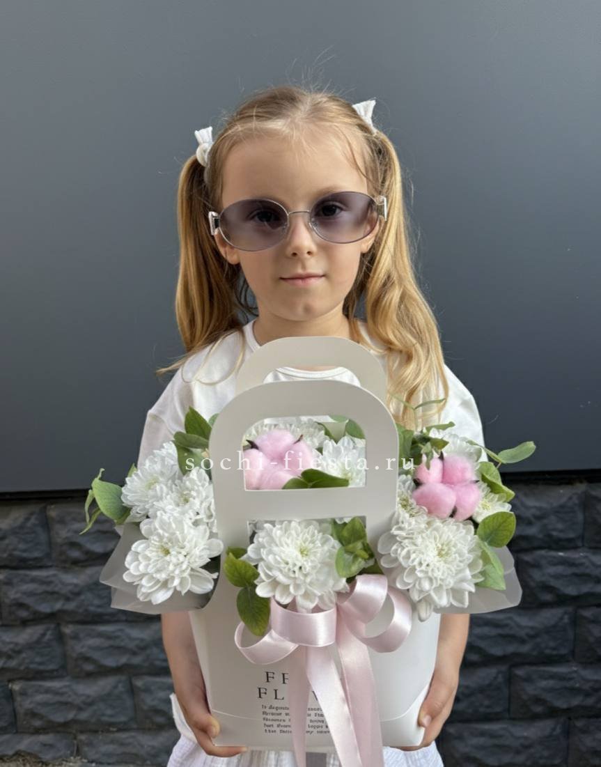 сумочка с гортензией, мисти баблс, герберой, озатамусом и эвкалиптом.
