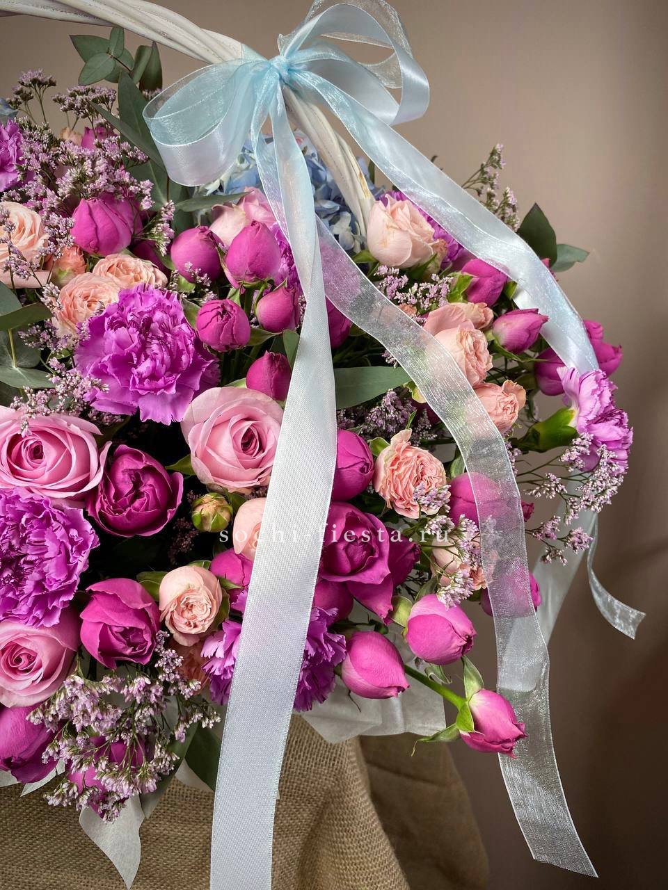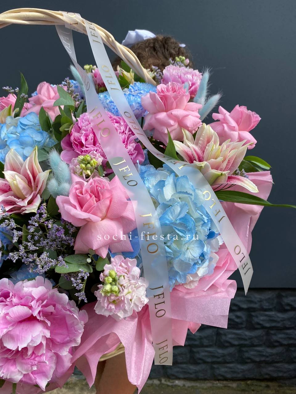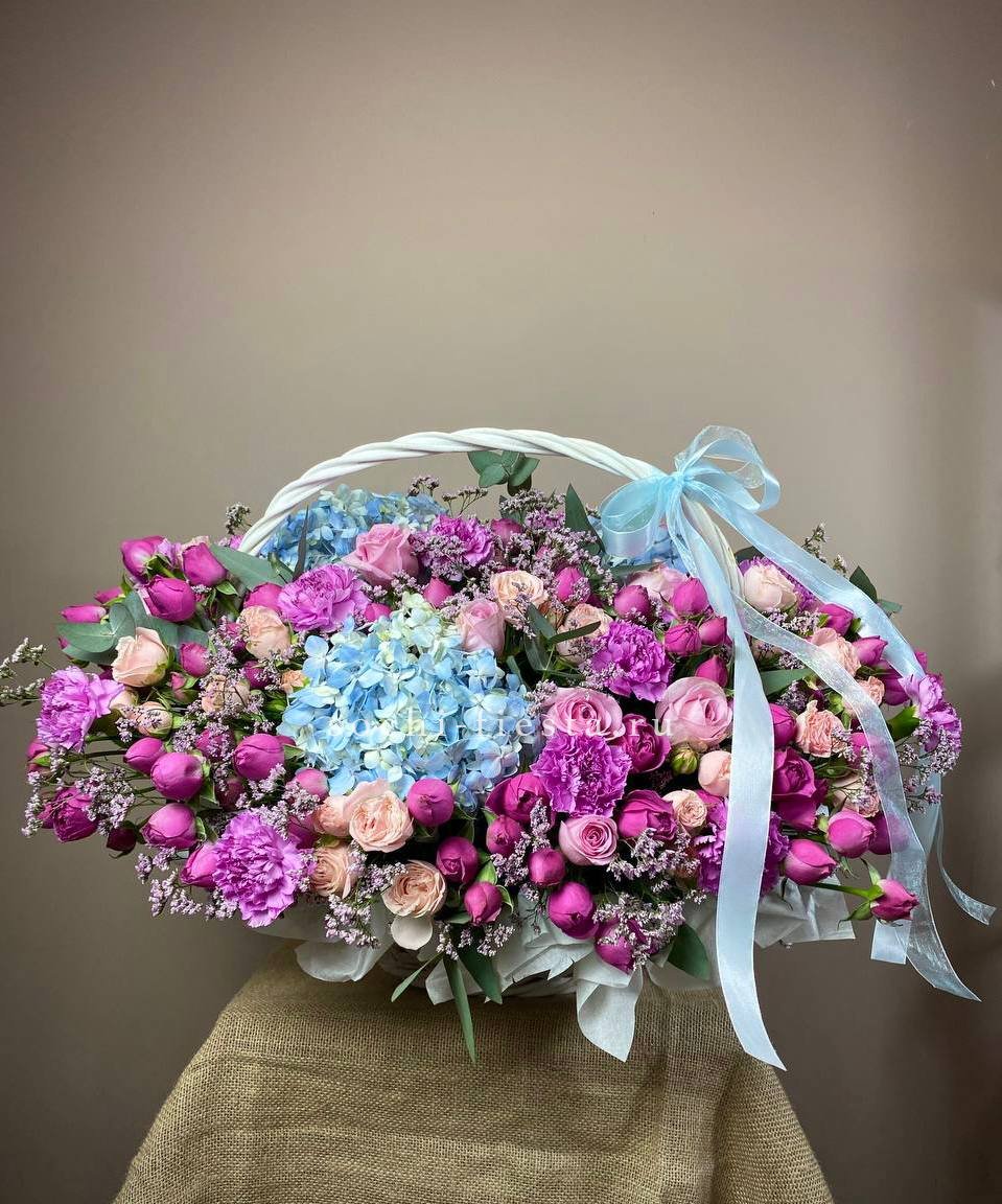 гортензии, лилии, хризантемы, пионы, лимониум, маттиола, корзина.